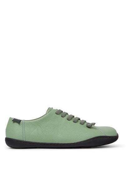 Grüner Damenschuh aus Leder mit einer Laufsohle aus 100% TPU (20% Recyclinganteil) und elastischen Schnürsenkeln.