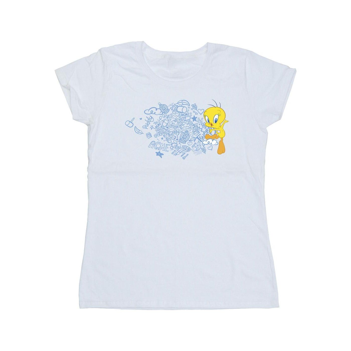 Dieses T-Shirt zeigt eine verspielte Grafik von Tweety Bird zusammen mit verschiedenen Kritzeleien und dem ACME-Logo. Das klassische Kurzarm-Design bietet eine bequeme und vielseitige Ergänzung für jede Freizeitgarderobe.