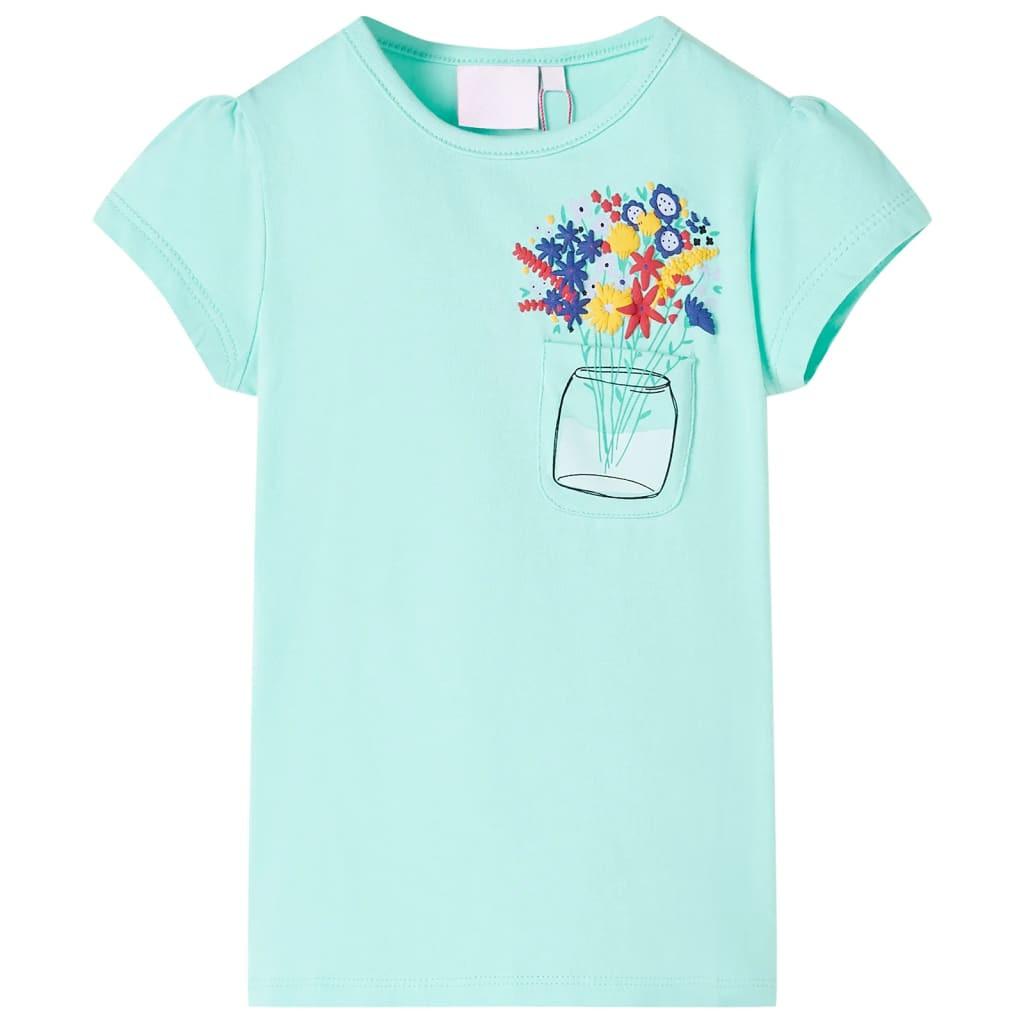 Dieses Kinder-T-Shirt hat kurze Ärmel, einen Rundhalsausschnitt und eine gerade Passform. Das T-Shirt in hellem Minzgrün ist mit einem wunderschönen Blumenstrauß und einer aufgesetzte Tasche auf der linken Brust versehen. Zu 95 % aus Baumwolle und zu 5 % aus Elastan gefertigt, ist das Kurzarmshirt komfortabel und atmungsaktiv.