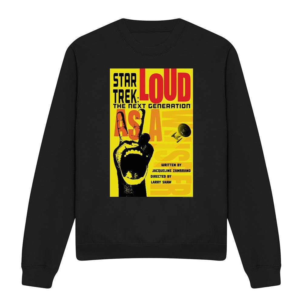Dieses Sweatshirt zeigt einen einzigartigen Grafikdruck, inspiriert von "Star Trek: The Next Generation" Staffel 2, Episode 5. Das Design präsentiert eine kühne, stilisierte Handgeste und das ikonische Starfleet-Abzeichen, vor einem leuchtend gelben Hintergrund mit dem prominenten Schriftzug "STAR TREK LOUD". Der Autor und Regisseur der Episode sind ebenfalls auf dem Druck vermerkt.