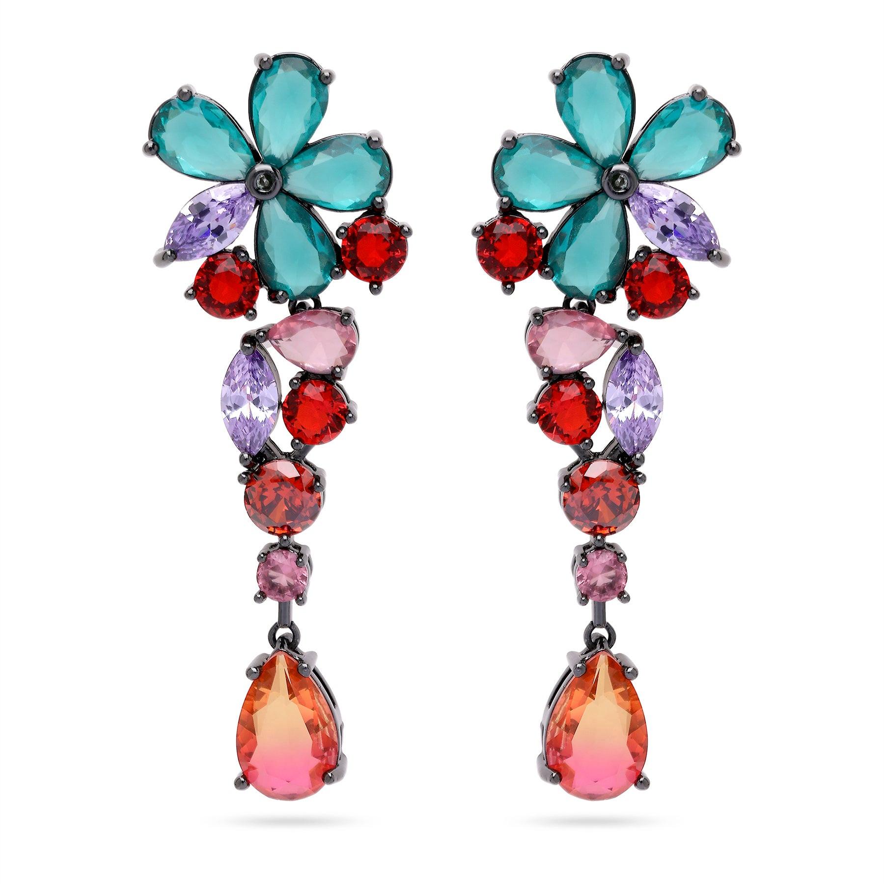 Diese atemberaubenden, mehrfarbigen Ohrringe bestechen durch ein florales Design mit tiefgrünen Blütenblättern, gefolgt von einer Kaskade aus roten, violetten und pinkfarbenen Edelsteinen. Die tropfenförmigen, rot-orangen Steine am unteren Ende setzen einen auffälligen Akzent und machen diese Ohrringe zu einem ausdrucksstarken und eleganten Statement-Piece für jeden Anlass. Größe: 1,8 cm x 5,8 cm | Beschichtung: Rhodiumplattiert | Verschluss: Stecker und Rückseite