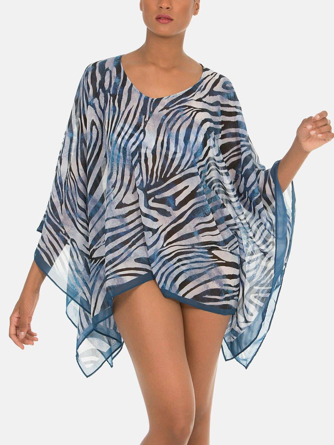 Blaue Farbe mit trendigem Zebramuster, fließende und asymmetrische Kleidung für einen perfekten Look am Strand.