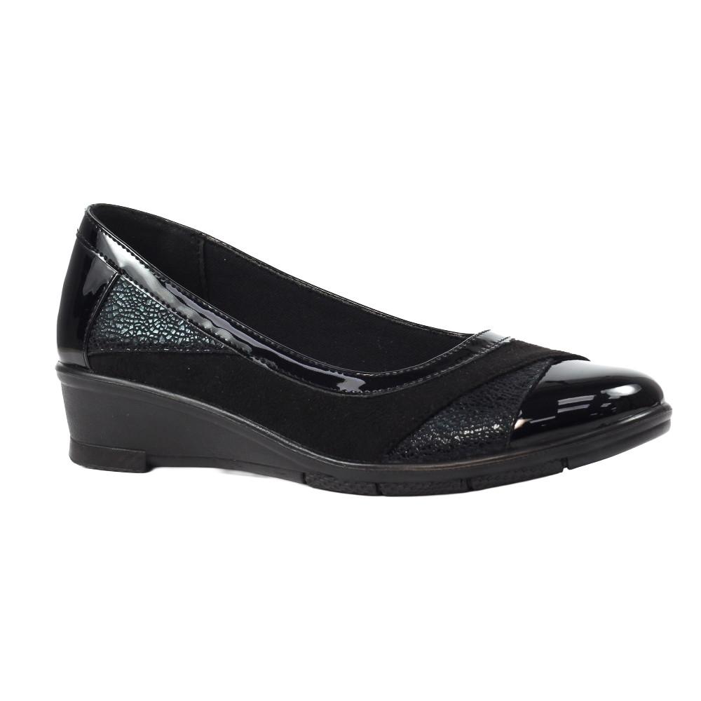 Diese Keilabsatzschuhe zeichnen sich durch ein raffiniertes Design mit einem Materialmix aus. Das Obermaterial kombiniert glattes und strukturiertes Kunstleder mit einem glänzenden Lack-Finish an Zehen und Ferse, was einen stilvollen Kontrast schafft. Der bequeme Keilabsatz sorgt für eine dezente Erhöhung und macht diese Schuhe für verschiedene Anlässe geeignet.