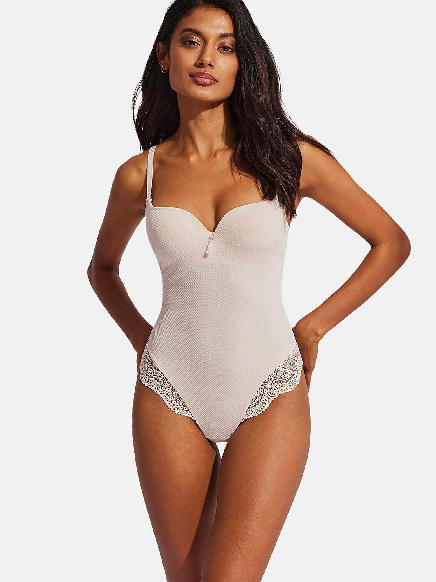 Der Body ist mit zarten Spitzendetails und einem charmanten Schmuckanhänger zwischen den Cups versehen. Die Vorderseite ist mit Tüll gefüttert, um einen leicht formenden Effekt zu erzielen, der den Körper formt und die Brust zentriert. Die mehrfach verstellbaren Träger und der Rücken ermöglichen die Anpassung an verschiedene Outfits, während die schmalen Träger für eine perfekte Passform verstellbar sind. Er verfügt über einen tiefen Rückenausschnitt und einen Hakenverschluss im Schritt mit einem Baumwollzwickel für garantierten Intimkomfort.