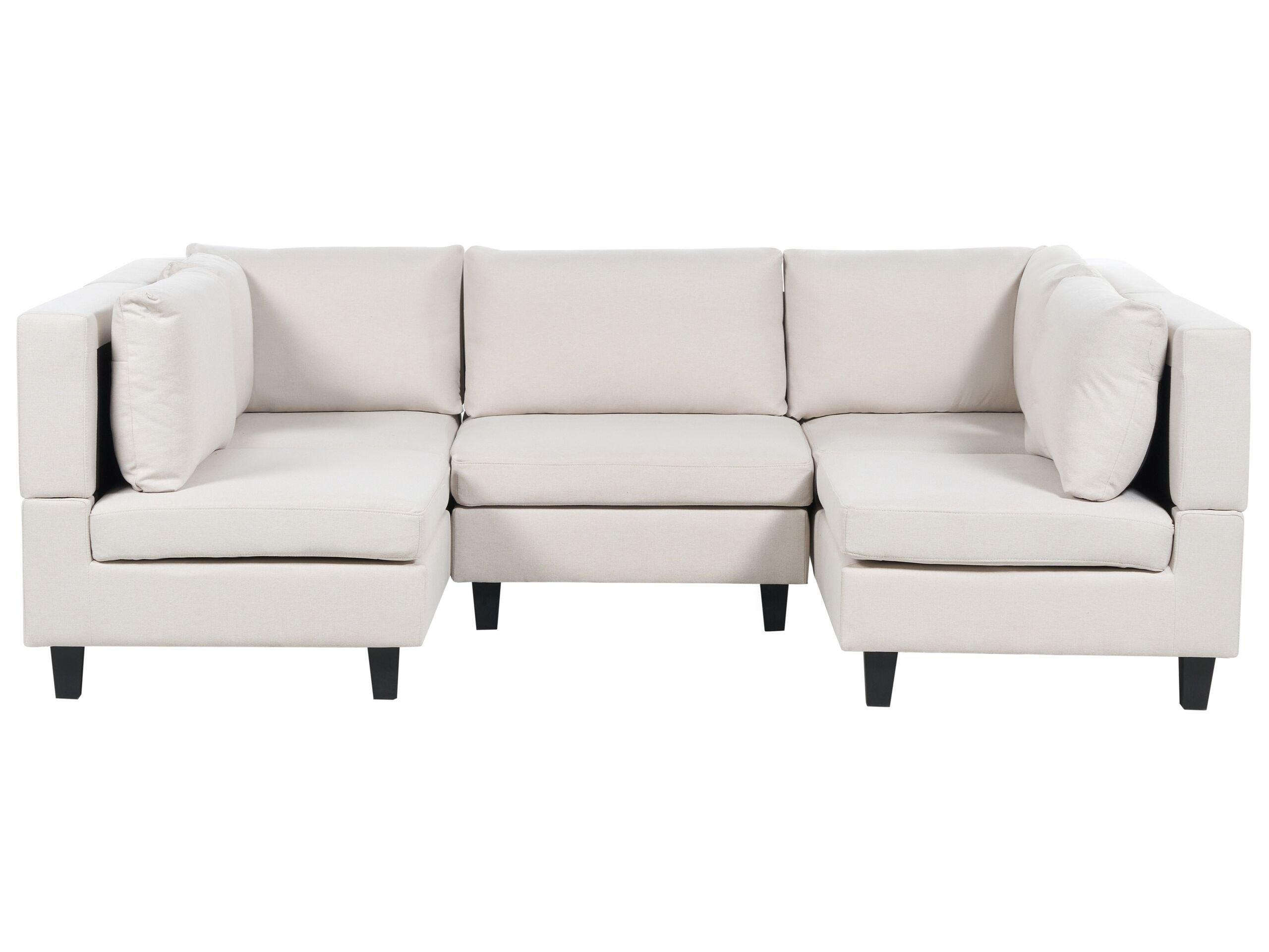 U-förmiges, modernes 5-Sitzer Modulsofa mit hellbeigem Stoffbezug. Kreieren Sie eine traumhafte Wohninsel nach eigenen Wünschen. Die Sitzplätze kann man miteinander verbinden, um eine U-förmige Wohnlandschaft oder ein lang gestrecktes Ecksofa zu erschaffen. Zudem kann man das multifunktionale Sessel-Modul und die passenden Eckmodule als eigenständige Möbelstücke nutzen. Der weiche Stoffbezug in edler Leinenoptik auf den Sitz- und Rückenkissen sorgt für ein herrliches Sitzgefühl, sodass Sie jede freie Minute mit Vergnügen auf dem Modulsofa verbringen werden.