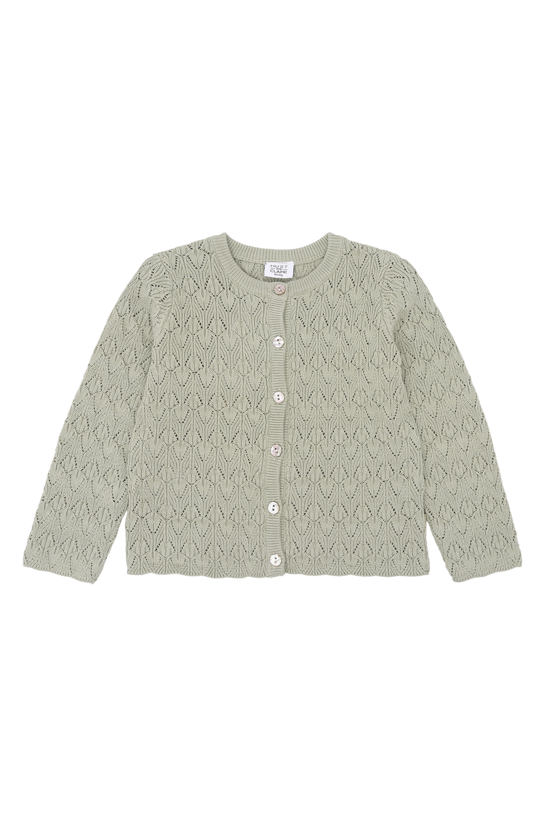 Cardigan aus weicher Baumwolle mit einem Lochmuster. Dieses Modell verfügt über ein welliges Rippbündchen am unteren Rand und wird vorne mithilfe von Knöpfen geschlossen. Dieses Produkt ist aus 100 % Bio-Baumwolle gefertigt.