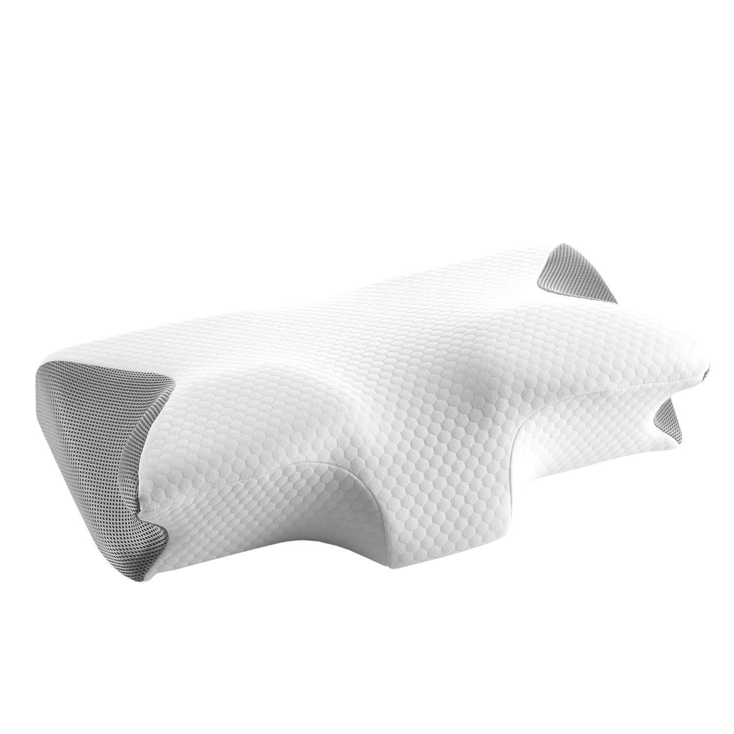 Dieses viskoelastische Kissen passt sich dem Körper an, um Kopf, Nacken, Arme und Ellbogen optimal zu stützen, je nachdem, wie es verwendet wird. Das Kissen hilft, mit der richtigen Haltung zu schlafen und die natürliche Krümmung des Nackens beizubehalten, was Nackenschmerzen vorbeugt und lindert. Es hat eine Vertiefung für den Kopf in der Mitte, für den Hals und eine auf jeder Seite für Arme und Hände.
