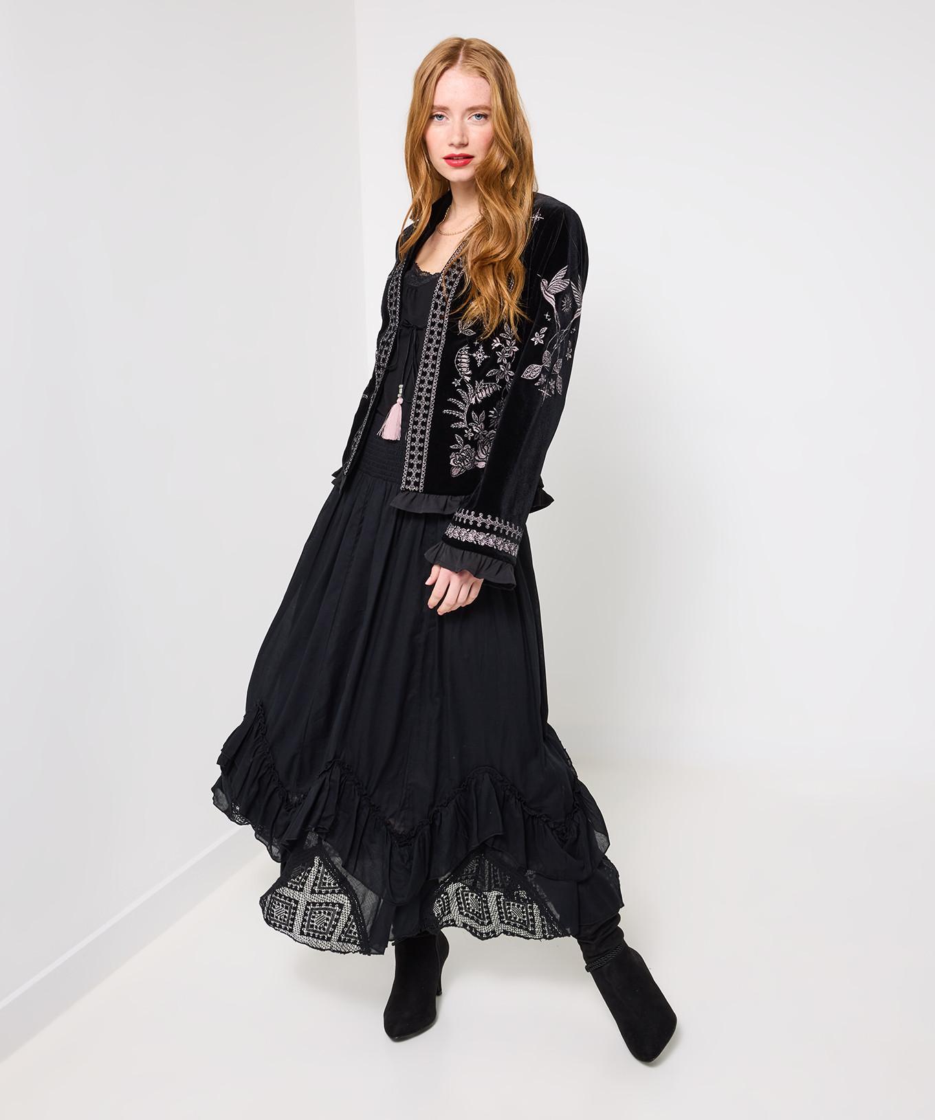 Dieser Maxirock verfügt über einen gesmokten Bund für eine bequeme und schmeichelhafte Passform. Das Design wird durch zarte Spitzen-Godets und ein einzigartiges Cutabout-Detail ergänzt, das der Silhouette eine elegante und unverwechselbare Note verleiht. Spitze, Rüschen und Raffungen machen diesen schwarzen Maxirock zu einem Highlight für jeden Boho-Herbstlook.