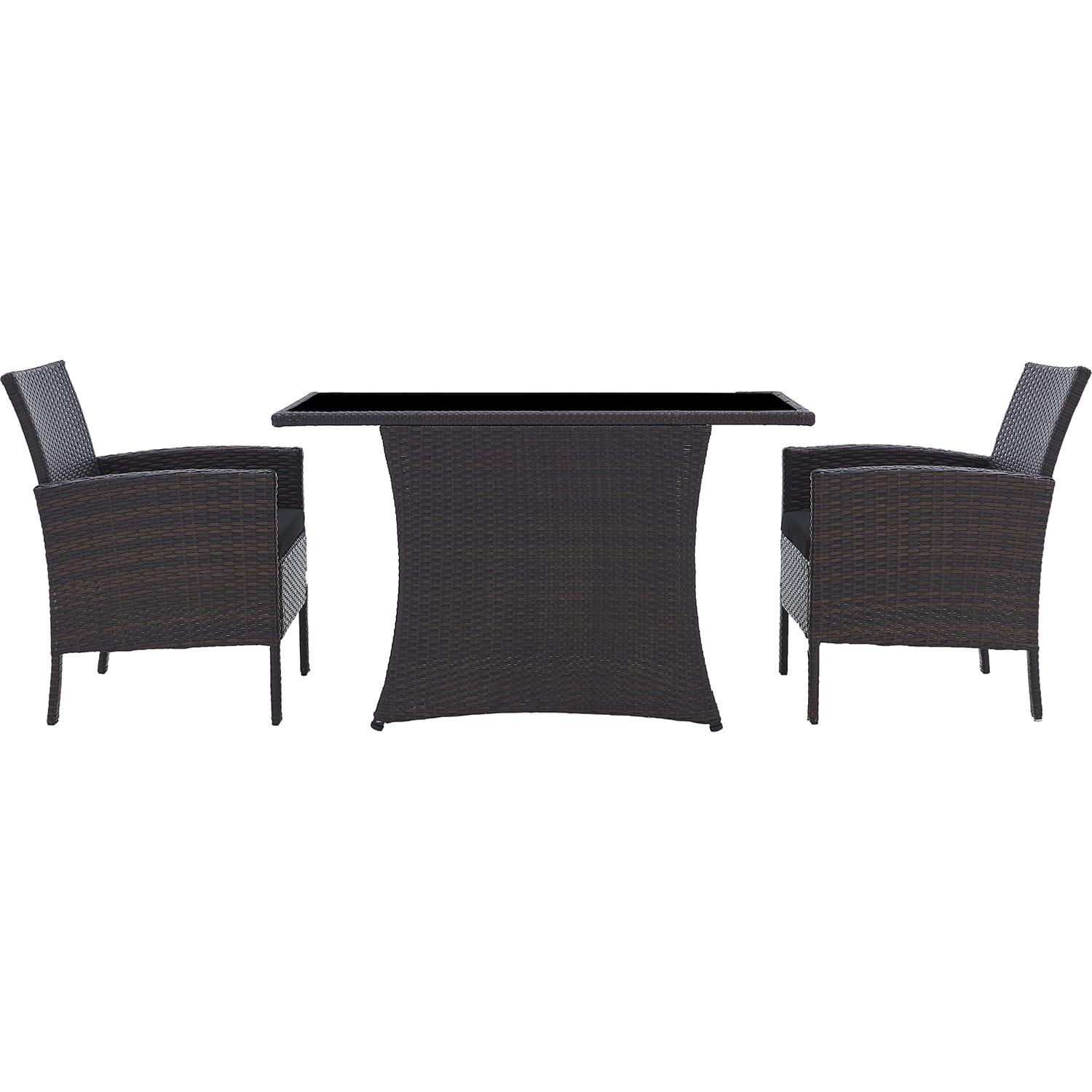 Bei schönem Wetter mit Familie oder Freunden draussen im Garten sitzen, dazu Kaffee und Kuchen und die Welt ist perfekt. Geniessen Sie den bequemen Sitzkomfort dieser Lounge. Diese stabile und wetterfeste Sitzgruppe aus Polyratten mit 2 komfortablen Sesseln inklusive Sitzkissen und einem Tisch mit pflegeleichter Glasplatte lässt mit seinem extravaganten Design keine Wünsche offen. Die Sessel lassen sich zudem platzsparend weit unter dem Tisch verstauen. Selbstverständlich können Sie diese Möbel aber auch in einem Wintergarten aufstellen. Egal, wo sie platziert werden, sie zaubern einen angenehmen Urlaubsflair.
