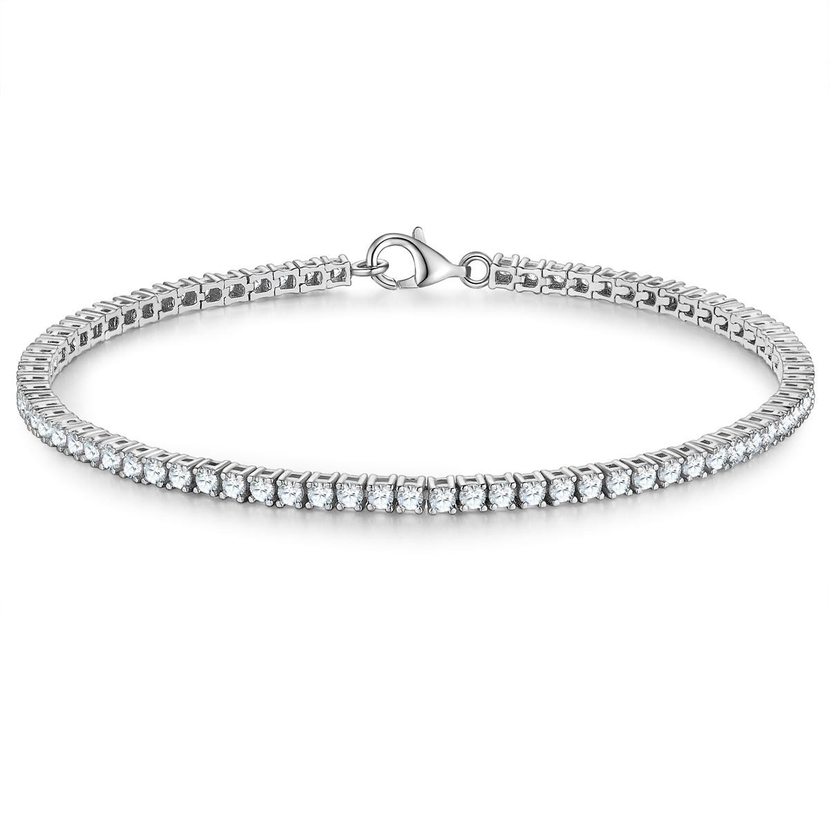 Das Tennis-Armband der Marke Trilani vereint zeitlose Eleganz mit hochwertiger Handwerkskunst. Hergestellt aus 925er Sterling Silber und rhodiniert für zusätzlichen Anlaufschutz, bietet dieses Schmuckstück dauerhaften Glanz. Die facettierten Zirkonia-Kristalle sind in Krappenfassungen dicht an dicht gesetzt und erzeugen ein brillantes Funkeln. Mit einer Breite von ca. 2,5 mm und in verschiedenen Längen erhältlich, passt das Armband perfekt an jedes Handgelenk. Ein sicherer Karabinerverschluss sorgt für optimalen Tragekomfort. Ob solo getragen oder als Ergänzung zu anderen Schmuckstücken, das Tennis-Armband von Trilani ist der ideale Begleiter für jeden Anlass.