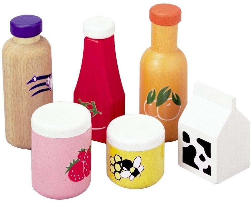 PlanToys Holzspielzeug EssenGetränke Set Dieses Set enthält Orangensaft, Wasser, Milch, Ketchup, Marmelade und Honig. Empfohlenes Alter: Ab 2 Jahren..