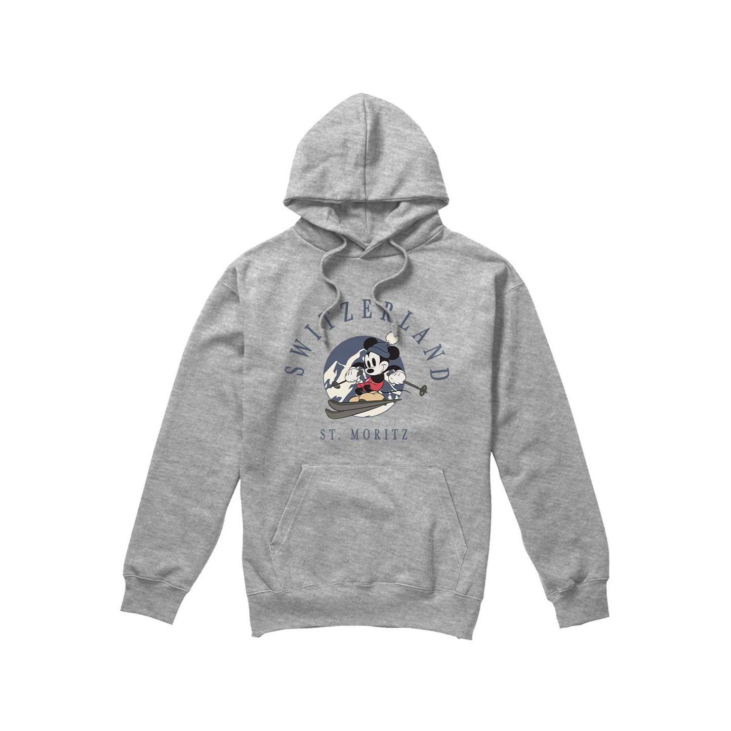 Dieser Kapuzenpullover zeigt einen verspielten Grafikdruck von Mickey Mouse beim Skifahren in St. Moritz, Schweiz. Das Design umfasst eine bequeme Kapuze mit Kordelzug und eine praktische Kängurutasche.