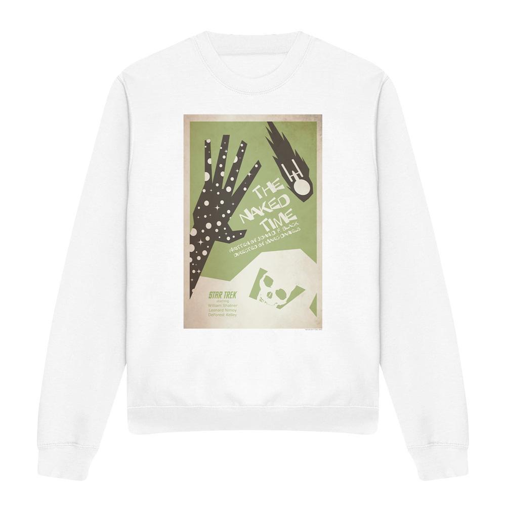 Dieses Sweatshirt zeigt einen einzigartigen Grafikdruck, inspiriert von "The Naked Time", der vierten Episode von Star Trek: The Original Series. Das Design fängt die Essenz der klassischen Episode mit einer stilisierten Darstellung einer Hand, eines Kometen und eines Schädels ein, alles vor einem gedämpften grünen Hintergrund.