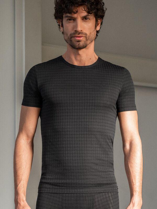 Dieses T-Shirt verfügt über eine auffällige geometrische Struktur, die Eleganz und Komfort auf höchstem Niveau vereint. Es ist mit einem Rundhals und kurzen Ärmeln gestaltet, was es zu einer vielseitigen Ergänzung für jede Garderobe macht. Die leichte und extrem elastische Mikrofaser sorgt für einen angenehmen Tragekomfort.
