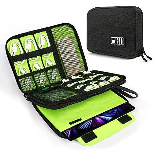 * Großes Fassungsvermögen Die Elektronik Tasche hat 2 Schichten Nylon Innenfach mit genügend Platz für Ihre Kabel, iPad (bis zu 11 Zoll), Kindle, Powerbank, USB-Laufwerk, Handy, Ladegerät, Maus und anderes Zubehör, halten Sie alle Ihre Elektronik-Zubehör an einem Ort. * Hochwertiges Material Die Ladegerät-Organizer-Tasche ist aus strapazierfähigem, langlebigem und wasserabweisendem Nylongewebe gefertigt, mit hervorragenden elastischen Schlaufen mit rutschfestem Griff, um sicherzustellen, dass die Kabel an ihrem Platz bleiben. Der hochwertige Doppelreißverschluss erleichtert den schnellen Zugriff und die Verwaltung der Gegenstände. * SICHERE AUFBEWAHRUNG: Mit inneren Netztaschen mit Reißverschluss, die es zu einer perfekten Tragetasche für Festplatten machen. Elastische Schlaufen machen die Tasche zu einem ausgezeichneten technischen Organizer. 1 x SD-Kartensteckplatz verhindert den Verlust der SD-Karte. Der Doppelreißverschluss an der Außenseite sorgt dafür, dass alle Produkte in der Elektronik-Tasche sicher sind. * Kompakt und tragbar: Größe ca. 11,2 x 8,3 Zoll (L x B), leicht, tragbar, für Reisen, einfach zu tragen und passt in Rucksack oder Handtasche ohne viel Platz zu nehmen. Ein großartiger Begleiter als Rucksack Organizer.