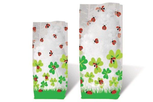 Geschenkbodenbeutel Marienkäfer aus lebensmittelechter Folie, transparent, bedruckt mit Marienkäfermotive