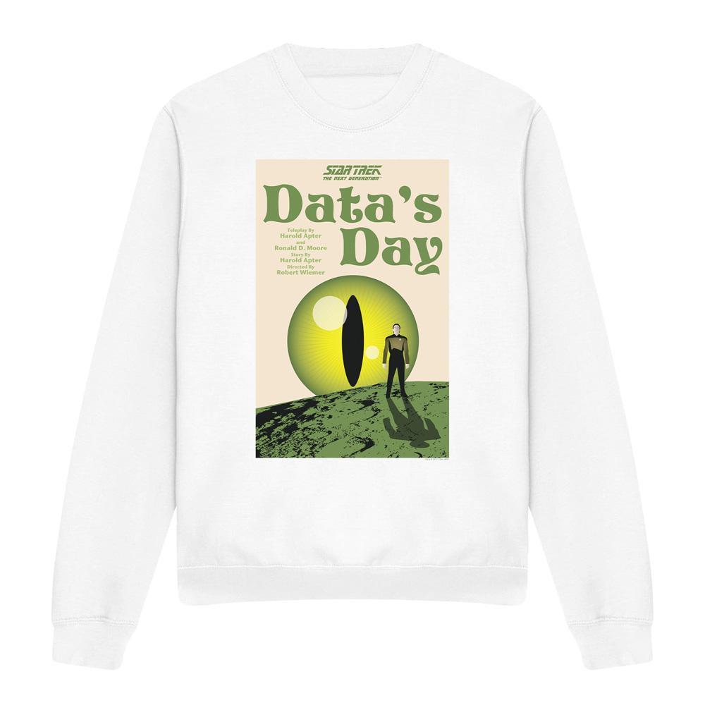 Dieses Sweatshirt zeigt eine einzigartige Grafik, inspiriert von "Data's Day", Staffel 4 Episode 11 von Star Trek: The Next Generation. Das Design fängt die Essenz der Episode mit einem markanten Bild ein, das dem beliebten Charakter Data Tribut zollt.