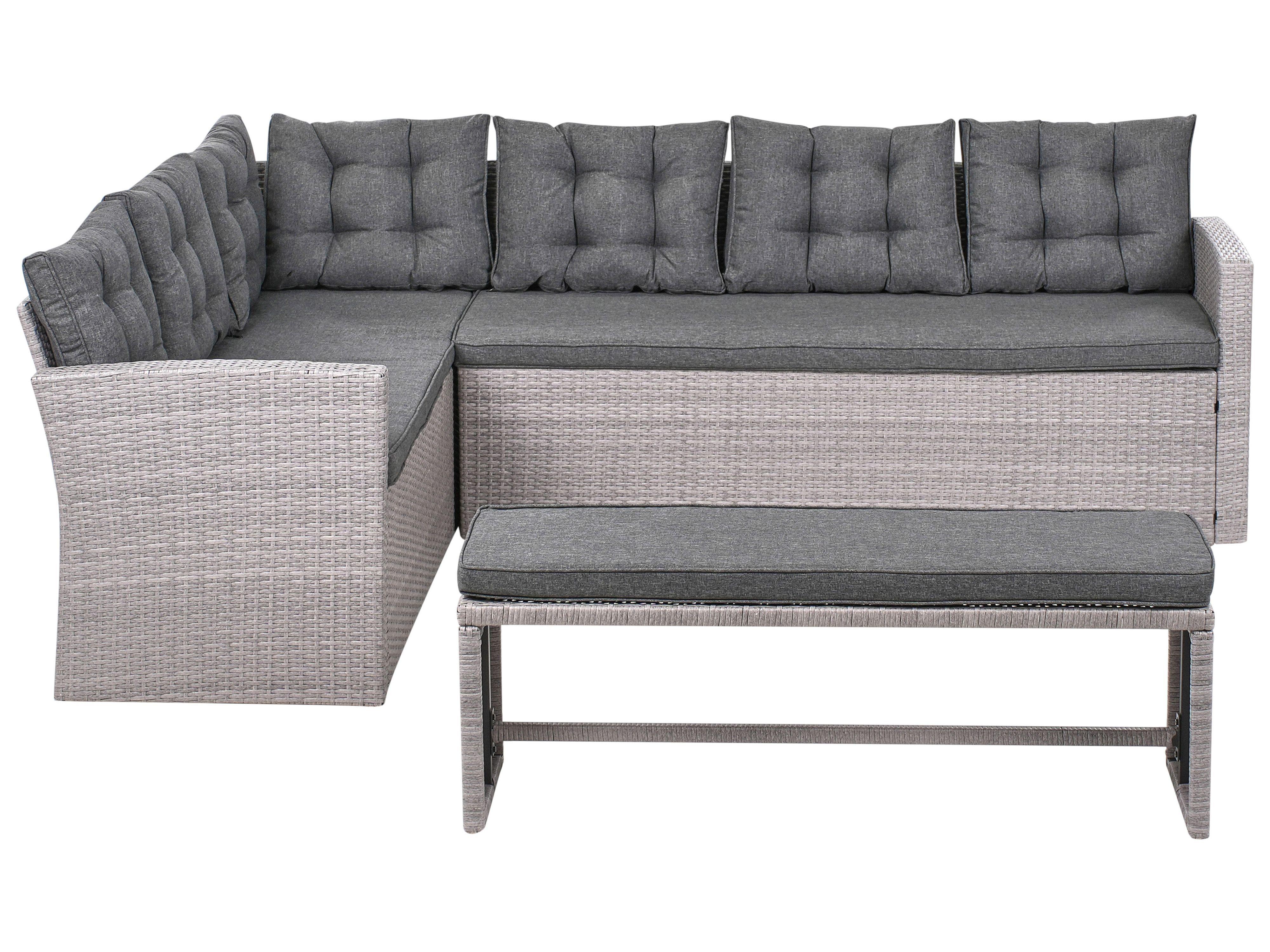 Elegantes Rattan-Ecksofa mit gemütlichen Auflagen und passender Sitzbank. Dieses robuste und zugleich gemütliche Lounge Set aus grauem Polyrattan ist witterungs- und strapazierfähig und schafft dank der grossen Eckcouch und der praktischen Sitzbank genug Platz für bis zu 8 Personen. Sowohl das Gartensofa als auch die Gartenbank sind mit bequemen Sitzkissen ergänzt, die Gemütlichkeit pur versprechen. Dabei steigern die gesteppten Rückenkissen den Sitzkomfort des Sofas noch zusätzlich. Da alle Kissenhüllen waschbar sind und das Set selbst äusserst pflegeleicht ist, eignet sich das Gartenset fantastisch für lange Sommerabende unter freiem Himmel.