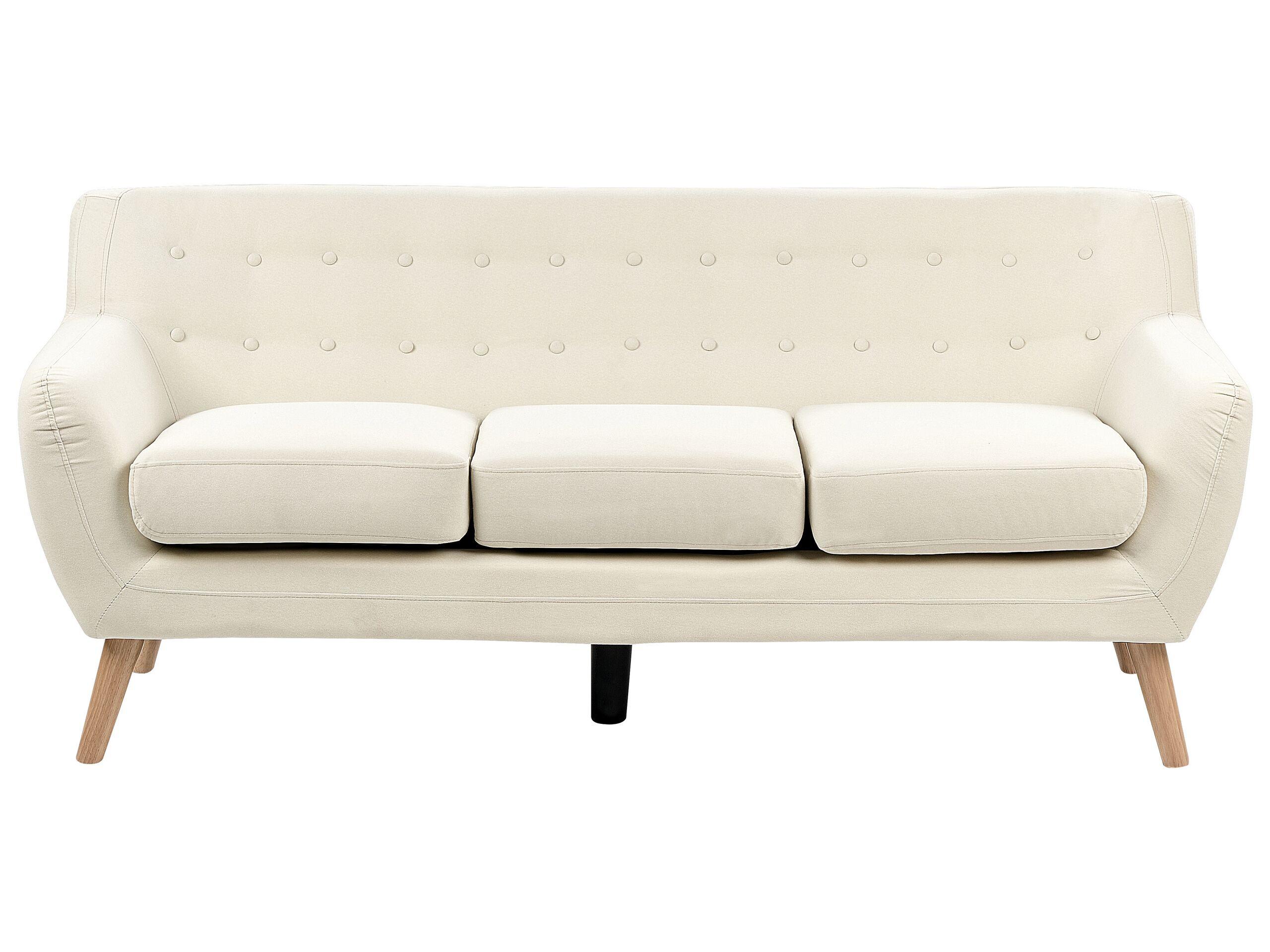 Gemütliches Polstersofa mit Armlehnen und Knopfheftung. Das 3er Sofa hat ein stillvolles und zeitloses Erscheinungsbild. Die hellbeige Couch ist mit ihren eleganten Formen ein absoluter Blickfang und die Knopfverzierungen runden das edle Design ab. Die hellen Holzbeine verleihen absolute Stabilität. Jedes Wohnzimmer wirkt durch dieses Sofa gemütlich und schick. Für lange Abende allein oder in Gesellschaft ist das Stoffsofa auf jeden Fall eine gemütliche Sitzgelegenheit.