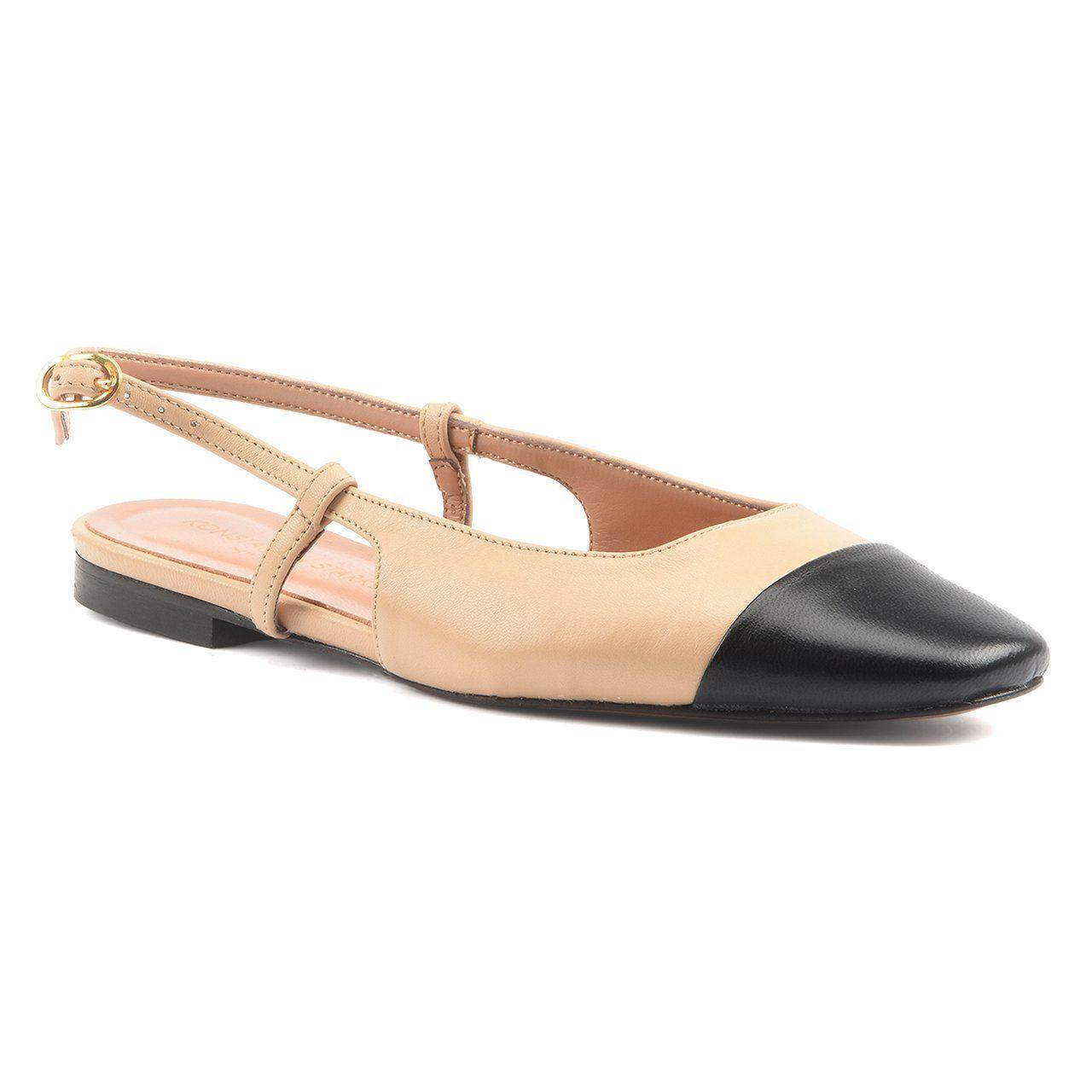 Die Capucine II Slingback Flats sind elegante Schuhe für Frauen, die Stil und Raffinesse schätzen. Hergestellt aus hochwertigem Leder verfügen diese Schuhe über ein raffiniertes beiges Oberteil, während Ferse und Vorderseite der Fersenbox mit einem Hauch von Schwarz verziert sind und einen Hauch von Raffinesse verleihen. Ein verstellbares Lederarmband, fixiert durch goldene Schnallen, ermöglicht es, die Passform des Schuhs an den Knöchel anzupassen. Die Innenseite des Schuhs ist mit Synthetik gefüttert, während die Innensohle und Außensohle aus Leder sind und eine Kombination aus Komfort und Haltbarkeit bieten. Die Schuhdetails, wie das Lederarmband und goldene Schnallen, zeigen die Sorgfalt in den Ausführungen, die diese Schuhe zu wahren Modestücken machen. Die Capucine II Schuhe sind ideal für Abende, Veranstaltungen oder sogar für einen schicken Bürotag.