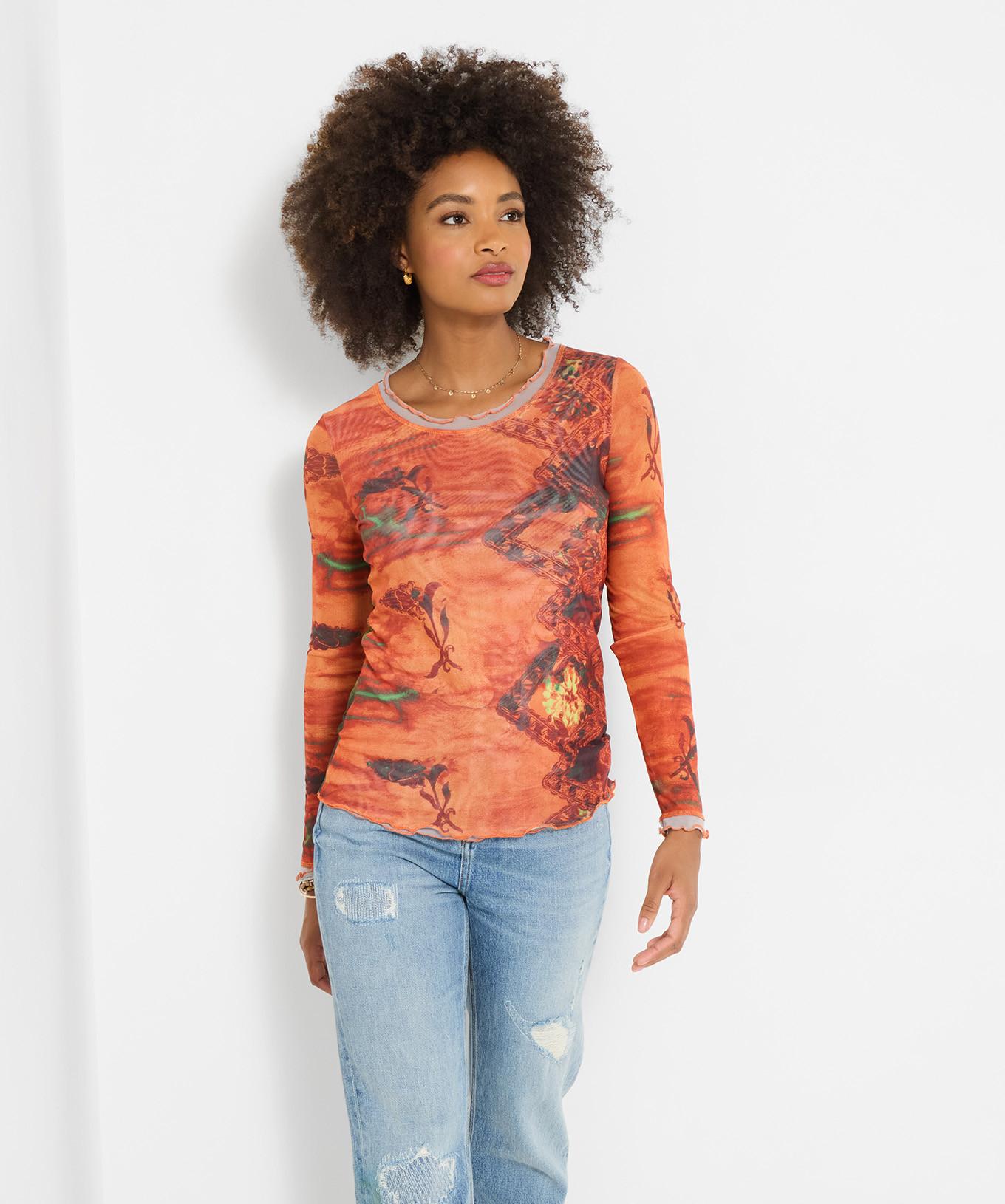 Feuriges Orange trifft auf Waldgrün: in diesem Mesh-Top im Lagen-Look sehen Sie einfach bezaubernd aus.