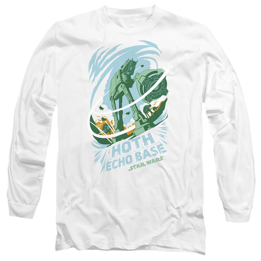 Dieses Langarm-T-Shirt zeigt einen auffälligen Grafikdruck, inspiriert vom ikonischen Echo Base Attack aus Star Wars. Das Design fängt die dramatische Szene mit AT-AT-Läufern in einer verschneiten Landschaft ein und macht es zu einem herausragenden Stück für Fans.