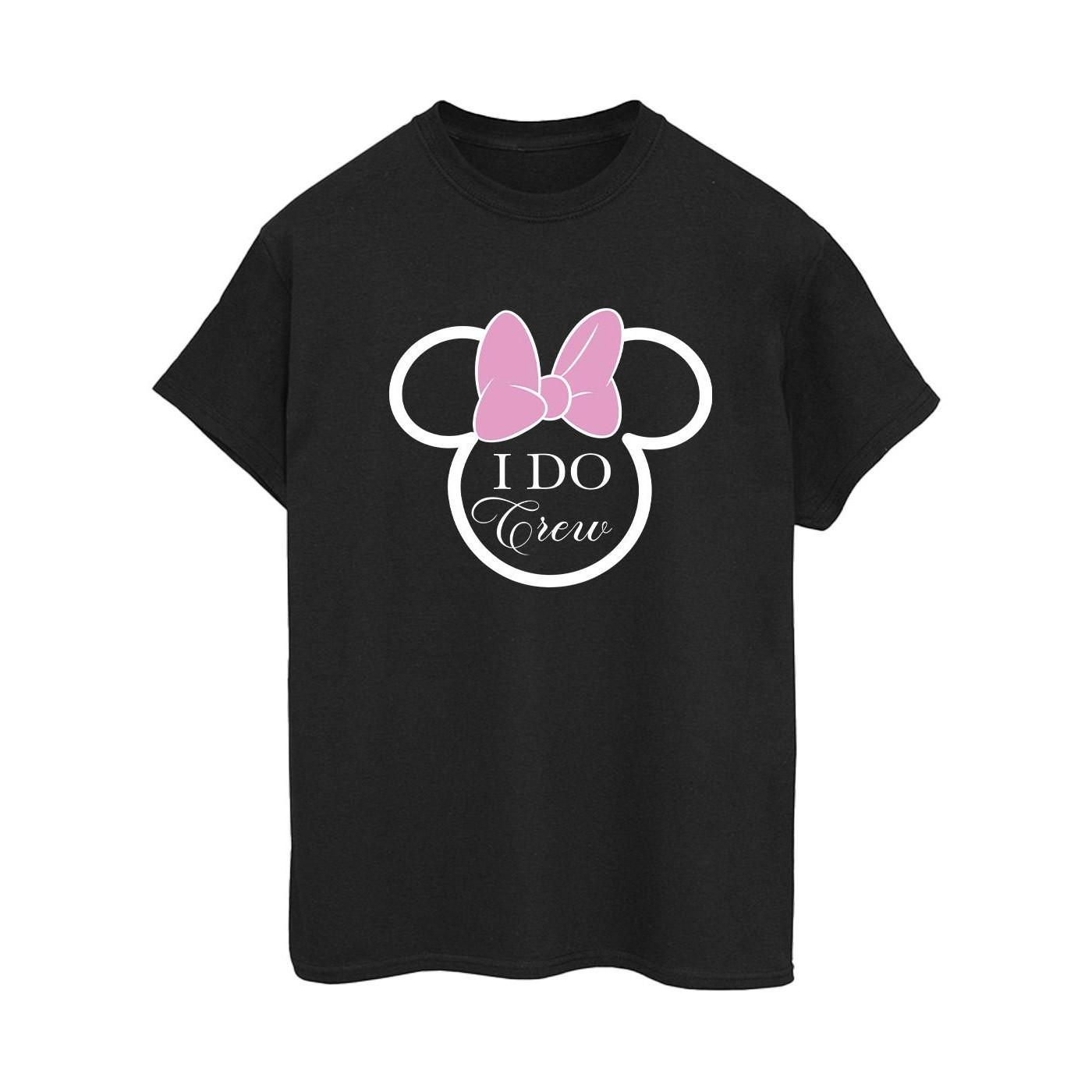 Dieses T-Shirt verfügt über einen klassischen Rundhalsausschnitt und kurze Ärmel, die eine bequeme und vielseitige Passform bieten. Die Vorderseite ist mit einem grafischen Druck verziert, der eine bekannte Mausohrsilhouette mit einer rosa Schleife und den Text "I Do Crew" in einer stilvollen Schriftart zeigt.