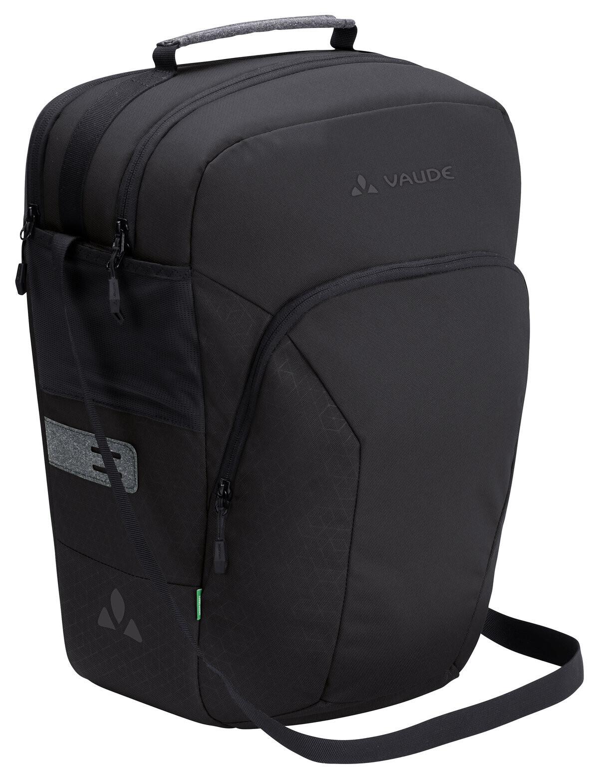 Die eBack Gepäckträger Fahrradtasche richtet sich speziell an Pendlerinnen oder Tourerinnen, die mit Laptop (bis 15,6") unterwegs sind und das Gerät sicher gepolstert verwahrt wissen wollen. Dabei spielt es keine Rolle, ob sie mit E- oder Bio-Antrieb unterwegs sind. Im großen Hauptfach kann ein zweiter Akku (bis 40 cm) oder eine Trinkflasche befestigt werden. Dazu findet alles Platz, was man unterwegs oder für die Arbeit benötigt - Unterlagen, Snackbox, Wechselwäsche. Ein Netzfach ordnet Ladekabel und andere Kleingegenstände. Dazu bietet die Fronttasche mit großem Eingriff viele Möglichkeiten zur Organisation. Die Gepäckträgertasche wird mit dem QMR 2.0-System stabil rechts oder links am Gepäckträger befestigt. Die Haken sind über einfach bedienbare Handrädchen justierbar. Mit einem kleinen Bügelschloss (z. B. Abus 145/20) kann die Radtasche direkt am QMR-Haken verriegelt werden. Die Gepäckträgertasche ist dank der ausgesteiften Seitenteile selbststehend. Lieferumfang: 1 Tasche, die entweder links oder rechts am Gepäckträger befestigt werden kann. Ein abnehmbarer Schultergurt, reflektierende Elemente und eine Regenhülle runden die umfangreiche Ausstattung ab. Die Gepäckträgertasche ist mit Eco Finish umweltfreundlich wasserabweisend ohne Fluorcarbone (PFC) ausgerüstet. Das VAUDE Green Shape-Label steht für ein umweltfreundliches, funktionelles Produkt aus nachhaltigen Materialien.