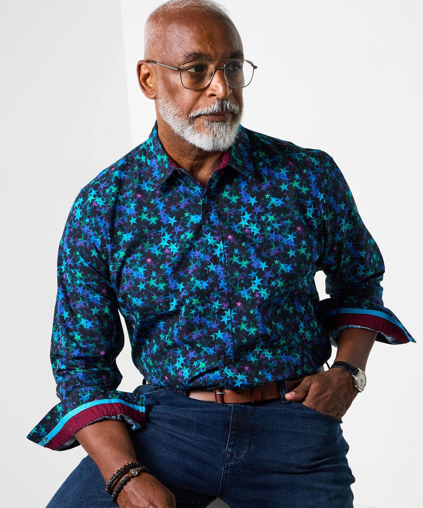 Dieses Langarmhemd präsentiert sich mit einem lebhaften Sternenmuster, das für einen unverwechselbaren und auffälligen Look sorgt. Der klassische Kragen bietet eine zeitlose Silhouette, während die kontrastierenden Manschetten einen raffinierten Akzent setzen. Dieses einzigartige Hemd sorgt für einen stilvollen Auftritt während der gesamten Partysaison.