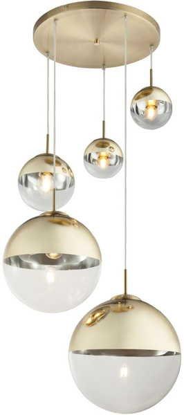 Diese moderne Hängeleuchte, aus der Serie Varus, überzeugt mit ihrer wunderschönen Optik. Der Durchmesser des runden Deckenelements beträgt 65cm, daran befinden sich fünf verschieden grosse Glaskugeln. Im oberen Teil ist die Glaskugel goldfarben. Durch ihr Design wird sie garantiert zu einem Blickfang in jedem Wohnzimmer oder Schlafzimmer. Dank fünf E27-Fassungen, haben Sie die Möglichkeit das Leuchtmittel bis max. 40 Watt zu bestimmen. Je nachdem welche Lichtfarbe und Lichtstärke Sie gerne hätten. Wir empfehlen Ihnen LED-Lampen, wegen ihrer Langlebigkeit und Stromersparnis. Sie können die Pendelleuchte sehr gut mit anderen Artikel dieser Serie kombinieren.