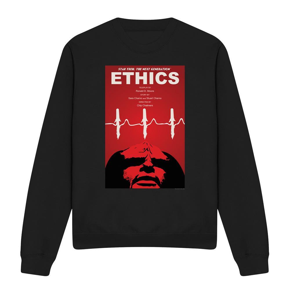 Dieses Sweatshirt zeigt einen grafischen Druck, inspiriert von "Ethics", Staffel 5 Episode 16 von Star Trek: The Next Generation. Das Design fängt die Essenz der Episode mit einem kräftigen rot-schwarzen Farbschema und einer stilisierten Herzmonitor-Grafik ein.
