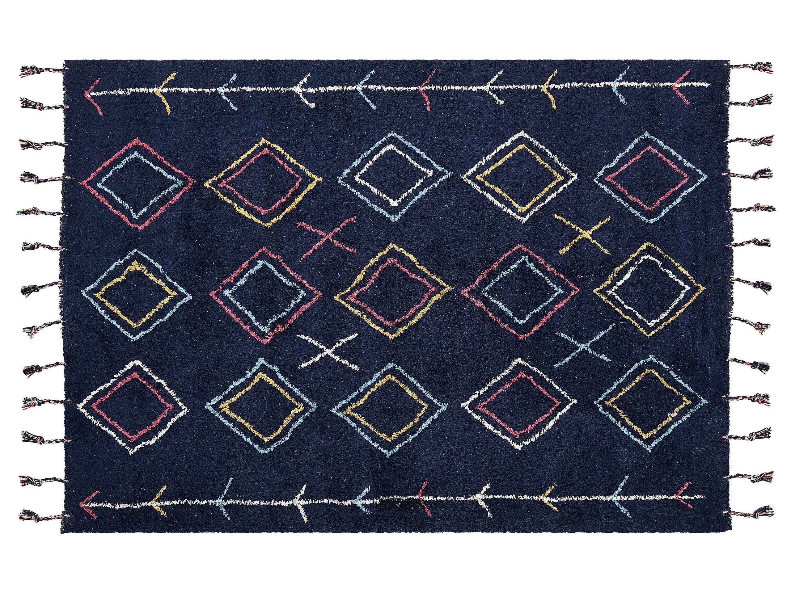 Handgetufteter Teppich mit buntem Muster im Boho-Stil. Dieser Teppich mit farbenfrohem Muster ist ein einzigartiges Dekorationsstück, das einen Boho-Touch in Ihr Wohn- oder Schlafzimmer bringen wird. Der handgetuftete Baumwollteppich ist ausserordentlich weich und sieht am besten neben dem Bett oder Sofa platziert aus. Die Quasten an den Seiten betonen den Boho-Stil des Teppichs, während die Farbkombination zu verschiedenen Einrichtungsstilen passt.