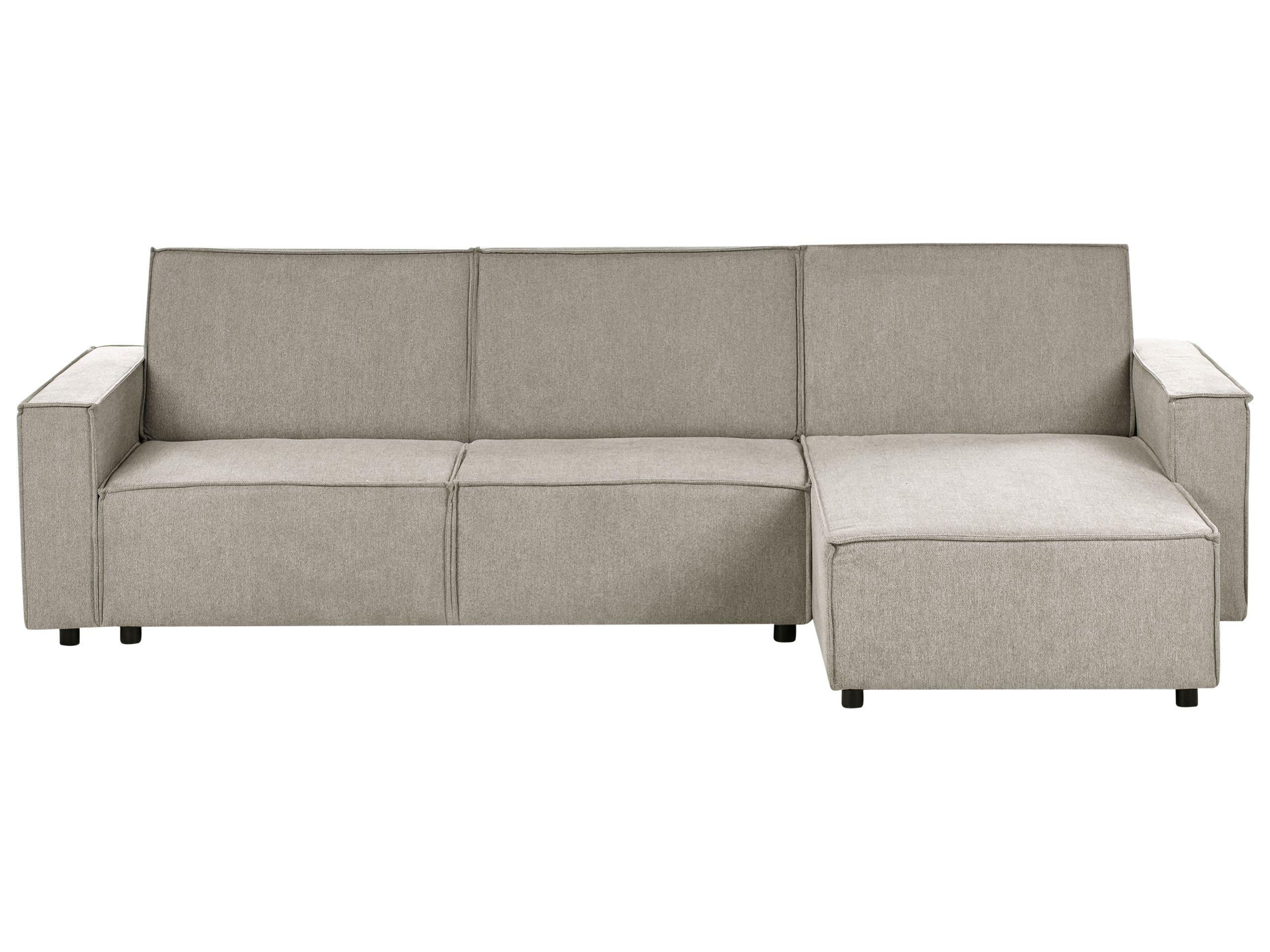 Modernes, grosses Ecksofa in Beige mit Schlaffunktion und Chaiselongue. Die weiche Polsterung des L-förmigen Sofas sorgt für ein herrliches Sitzgefühl. Das besondere an dem Modell ist, dass man die Chaiselongue entweder auf der linken oder rechten Seite platzieren kann. So können Sie Ihr Wohnzimmer auf vielfältige Weise gestalten und sich gleichzeitig einen gemütlichen Platz zum Ausruhen schaffen. Mit Hilfe des praktischen und einfach zu bedienenden Klick-Klack-Systems können Sie dieses Sofa in ein bequemes Bett verwandeln und Ihre Freunde getrost zur Übernachtung einladen. Durch die niedrigen Kunststoff-Beine liegt das Polstersofa näher am Boden, was für einen soliden Stand und ein schlichtes Erscheinungsbild sorgt.