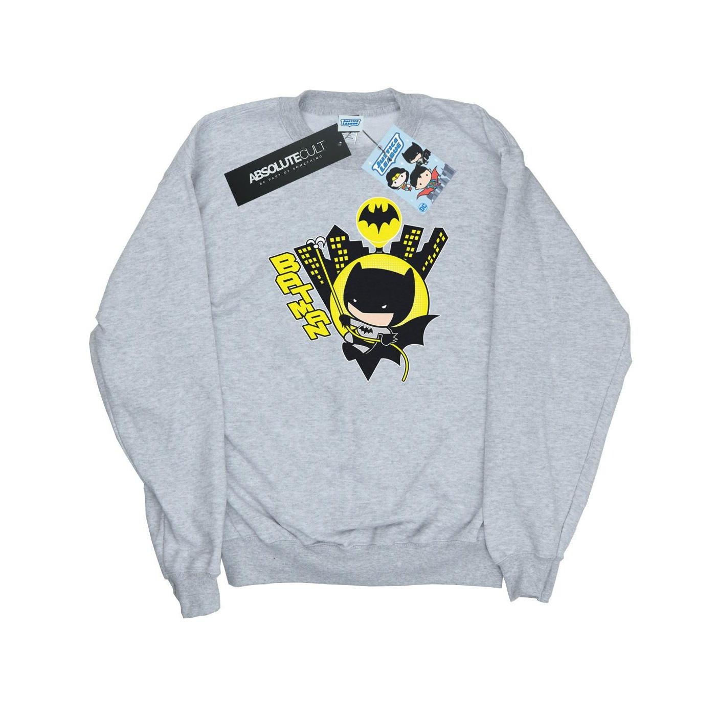 Dieses Sweatshirt zeigt eine verspielte Grafik im Chibi-Stil von Batman vor einer Stadtsilhouette, über der das ikonische Bat-Signal leuchtet. Das Design fängt eine lustige und dynamische Darstellung des klassischen Superhelden ein.