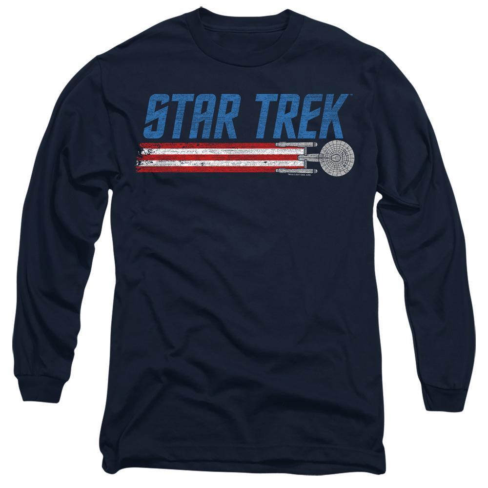 Dieses Langarm-T-Shirt zeigt einen Grafikdruck, der von der ikonischen Star Trek-Serie inspiriert ist. Das Design umfasst das "STAR TREK"-Logo in Blau, begleitet von einer stilisierten Darstellung der USS Enterprise, mit roten und weissen Streifen, die sich von den Gondeln des Schiffes erstrecken.