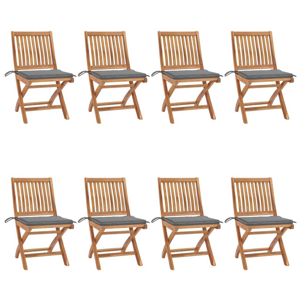 Das für dieses Möbelset verwendete Teakholz ist technisch getrocknet und anschließend fein geschliffen worden, um ein sehr glattes Erscheinungsbild zu eralten. Teakholz ist für seine außergewöhnliche Festigkeit und Witterungsbeständigkeit geschätzt und eignet sich daher besser für Gartenmöbel als jede andere Holzart. Teakholz ist die perfekte Wahl, wenn Sie ein langlebiges Gartenmöbel erwerben möchten. Dank der geschliffenen Oberfläche sind die Essstühle witterungsbeständig und leicht zu reinigen. Sie können auch zusammengeklappt werden, um bei Nichtgebrauch Stauraum zu sparen. Darüber hinaus sorgen die mitgelieferten Kissen für zusätzlichen Komfort. Jedes Kissen ist mit je 2 Bändern an zwei Ecken zur festen Befestigung am Stuhl versehen.