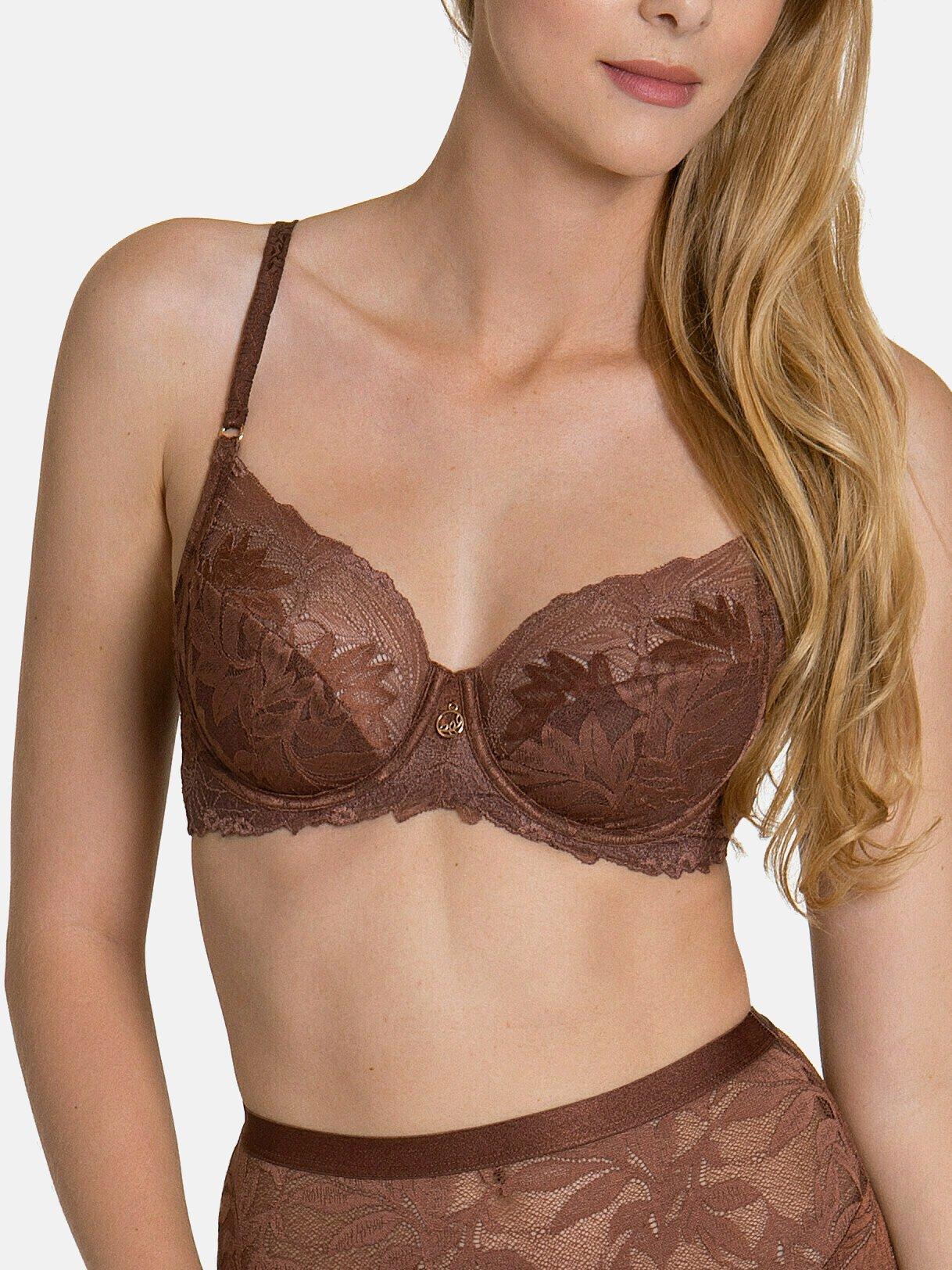 Dieser Bügel-BH aus der Harvest-Kollektion bietet sowohl Halt als auch eine zarte Ästhetik. Er verfügt über ein vierteiliges Cup-Design, das eine schöne Form verleiht. Die Cups sind für eine bessere Passform mit weichem, elastischem Tüll gefüttert. In den größeren Größen ist der Rücken zusätzlich mit weichem, elastischem Tüll gefüttert, um einen besseren Wickelkomfort zu gewährleisten. Ein dekoratives Metallornament in Roségold befindet sich in der Mitte. Das Verschlussband und die Träger sind verstellbar und in den größeren Größen breiter.