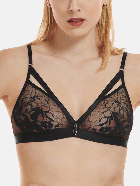 Dieser bügellose BH aus der Flamenco-Kollektion präsentiert sich in einer ungefütterten, hoch geschnittenen Dreiecksform. Der nicht elastische Tüll ist vollständig in den Körbchen verborgen und bietet gleichzeitig eine hervorragende Brustunterstützung. Der Unterbrustbereich besteht aus einem breiten Gummiband mit einem dekorativen Verschluss in der Mitte. Ein raffiniertes, oval geformtes versilbertes Metalldetail befindet sich zwischen den Cups. Das Verschlussband und die Träger sind für eine perfekte Passform verstellbar und in größeren Größen breiter.