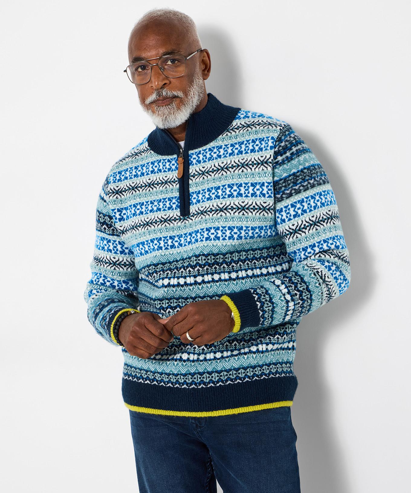 Dieser Fair-Isle Strickpullover präsentiert sich mit einem klassischen Muster und einem bequemen Stehkragen. Das Design umfasst einen praktischen Reissverschlusskragen, der ihn zu einer vielseitigen Ergänzung für jede Garderobe macht.