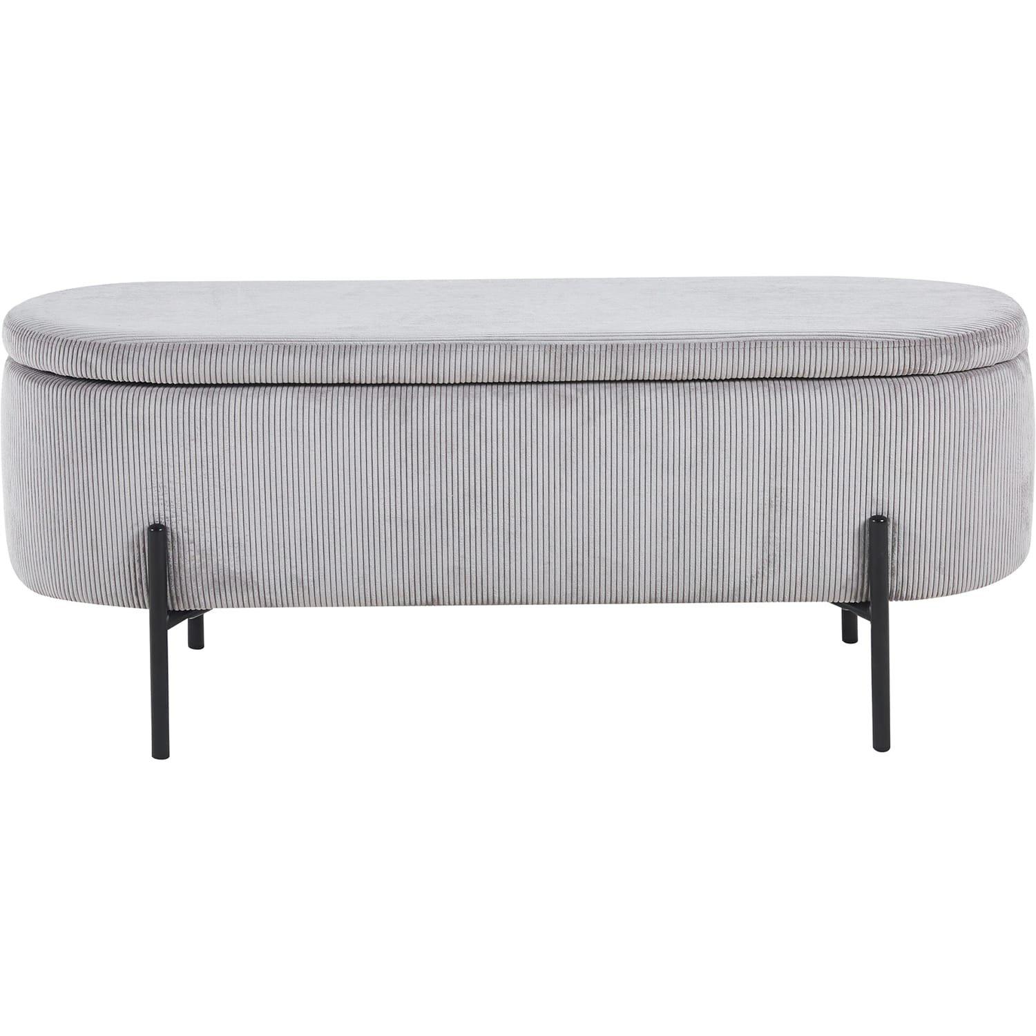 Wer skandinavisches Design mit praktischem Nutzen sucht, für den ist diese Bettbank mit angesagtem Cord Bezug die richtige Wahl. Der Polsterhocker punktet nicht nur mit topaktuellem Design, sondern bietet hinter dem klappbaren Deckel auch eine clevere Stauraumfunktion. Ob Decken, Bettbezug oder Kleidung In der Bettbank können Sie auf stilvolle Weise Ordnung schaffen und Herumliegendes verstauen. Der weiche Cord-Stoff verleiht der Bettbank einen modernen Look und sorgt mit seinen charakteristischen Nähten für eine interessante Optik. Das Design-Gestell mit hohen Füssen besteht aus pulverbeschichtetem schwarzem Metall und rundet den Look ab.Bezug in Cord-Optikfrei im Raum stellbarSitzhöhe: 44 cmmit aufklappbarem Element und Stauraum in InnerenBezug aus 88% Polyester/12% Nylonmax. Belastbarkeit: 150 KGBeine schwarz Metall (Stahl) pulverbeschichtetschwarzes Design-Gestell aus pulverbeschichtetem Metall