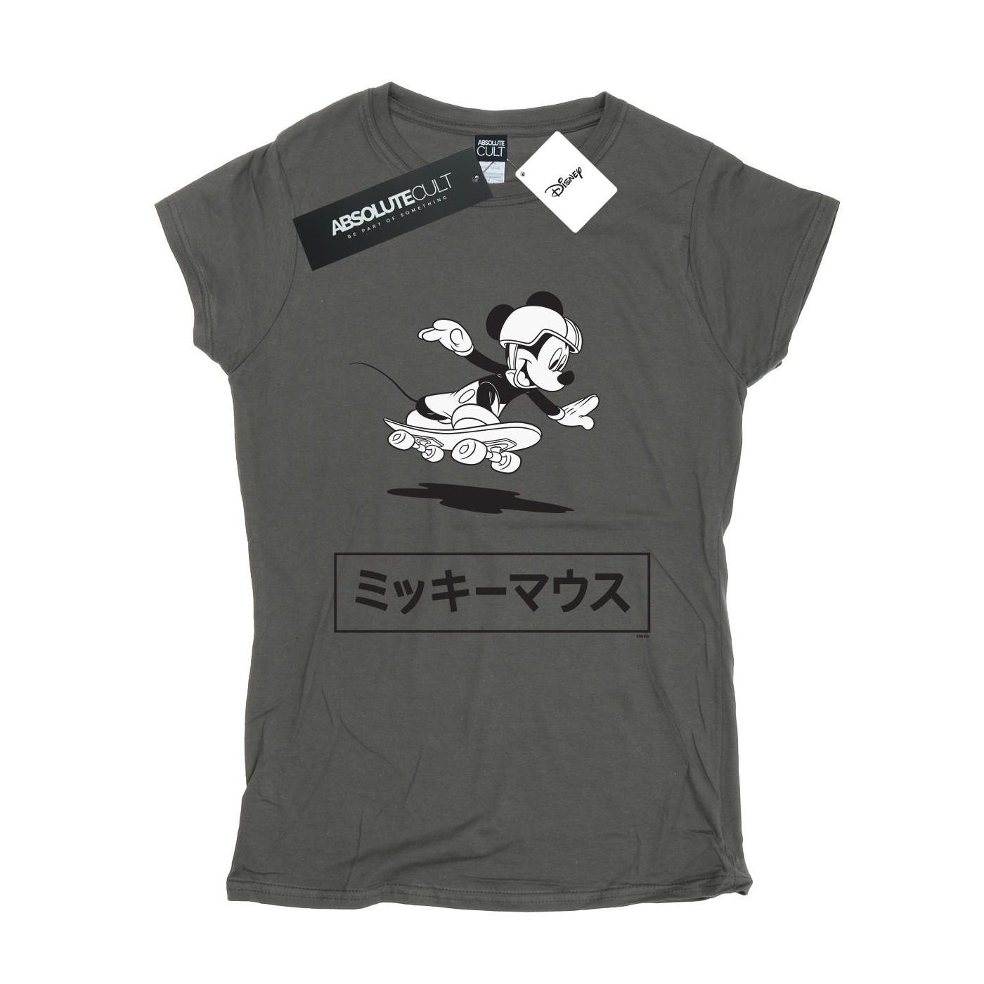 Dieses T-Shirt verfügt über einen klassischen Rundhalsausschnitt, kurze Ärmel und eine normale Passform. Es ist ein offiziell lizenziertes Disney-Produkt, das Mickey Mouse beim Skateboardfahren mit japanischem Text darunter zeigt.