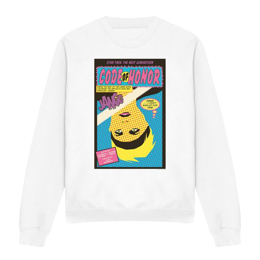 Dieses Sweatshirt zeigt einen einzigartigen Grafikdruck, inspiriert von "Star Trek: The Next Generation" Staffel 1 Episode 4, "Code of Honor". Das Design fängt die Essenz der Episode mit einer lebendigen, Comic-artigen Illustration ein.