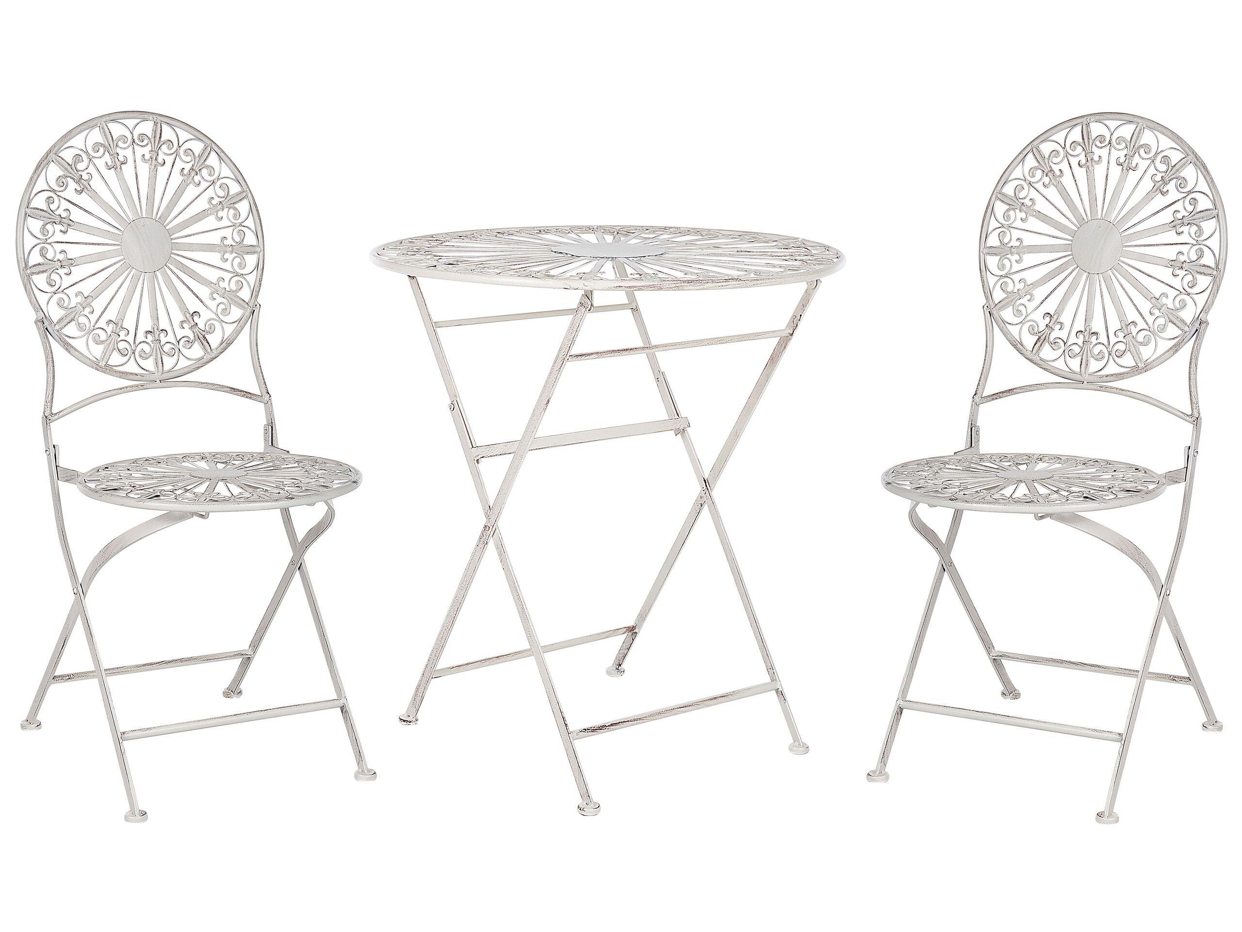 Balkonset mit Antik-Effekt . Mit diesem wunderschönen Balkonset können Sie sich eine vom französischen Stil inspirierte Ecke in Ihrem Aussenbereich einrichten. Es besteht aus einem runden Tisch und zwei Stühlen, die jeweils mit einem äusserst dekorativen Design und einem Antik-Effekt versehen sind, der einen Vintage-Akzent setzt. Das Set sieht nicht nur bezaubernd aus, sondern ist auch faltbar, was Ihnen ermöglicht, Platz zu sparen und es leicht zu transportieren. Egal, ob Sie mit Ihrem Liebsten oder einem Freund zu Abend essen oder einfach nur eine Tasse Kaffee an der frischen Luft genießen möchten, dieses Set ist die perfekte Wahl.