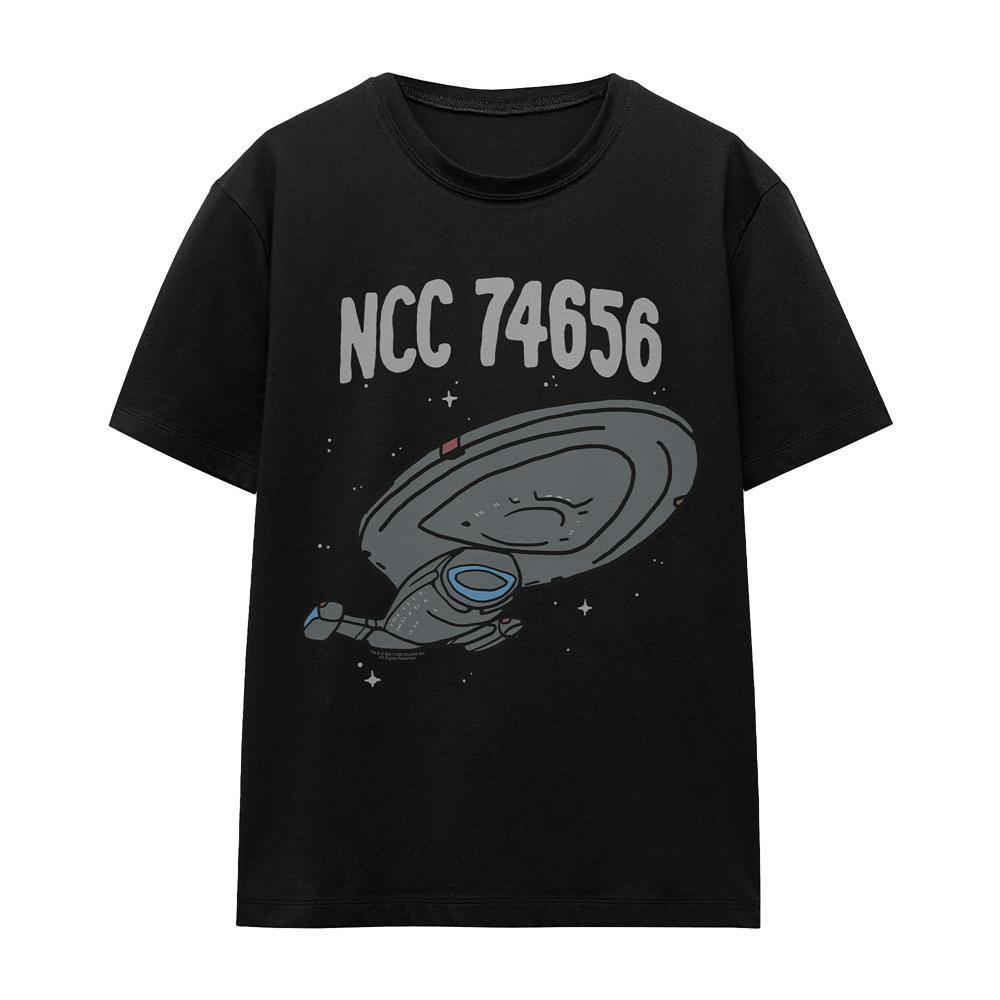 Dieses T-Shirt zeigt einen grafischen Druck des Raumschiffs Intrepid Class, NCC 74656, aus Star Trek. Das Design ist prominent auf der Vorderseite platziert und macht es zu einem unverwechselbaren Stück für Fans.