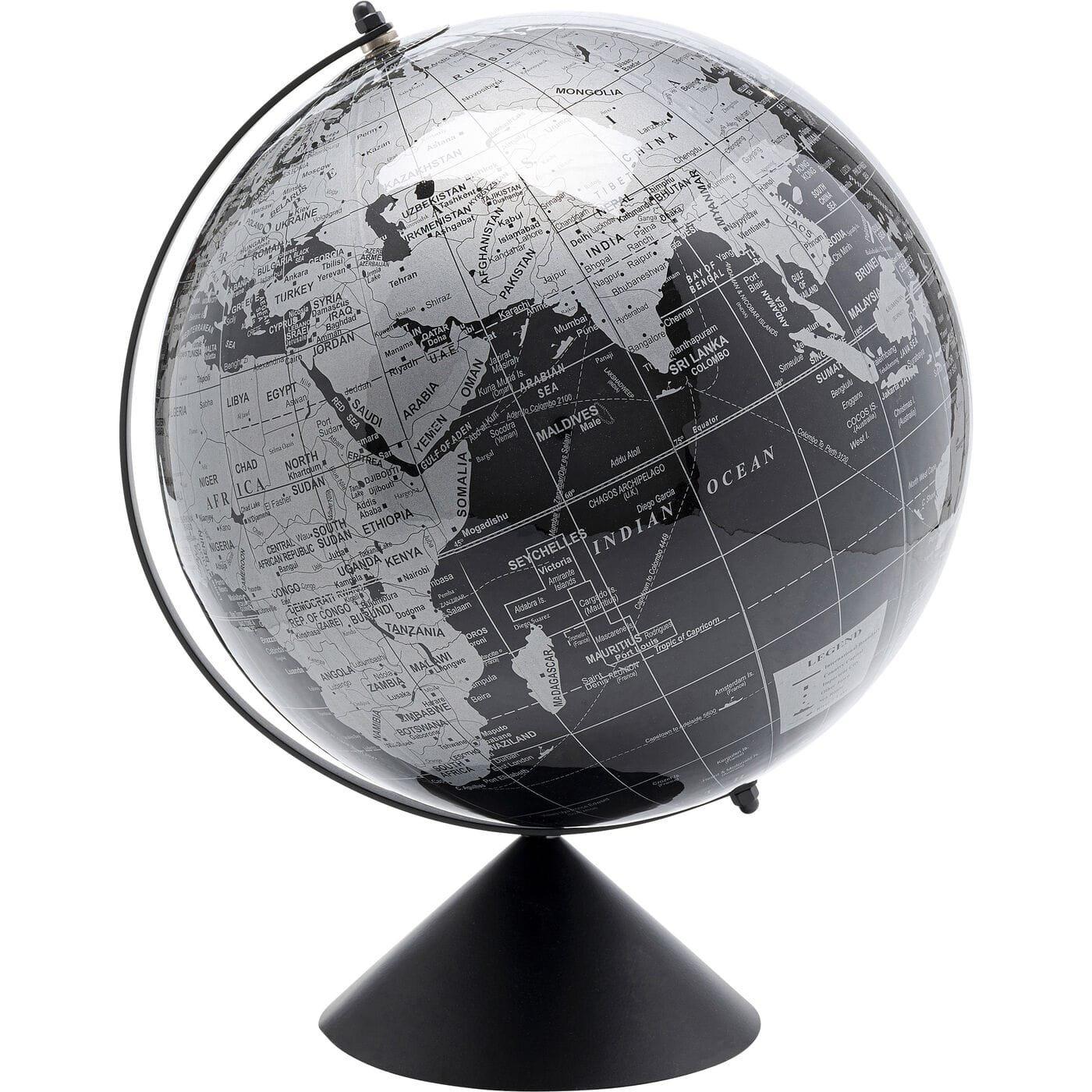 Deko Objekt aus Kunststoff und Edelstahl, Farbe schwarz, 40 x 30 x 30 cm, Objekt: High Impact Polystyrene klar lackiert, Papier Beschichtung (Material Karte), Gestell: Edelstahl pulverbeschichtet, Objekt: 30 cm Ø Masse sonstige Weltkugel, 17 cm Ø Sockel, montiert, teilweise handarbeit