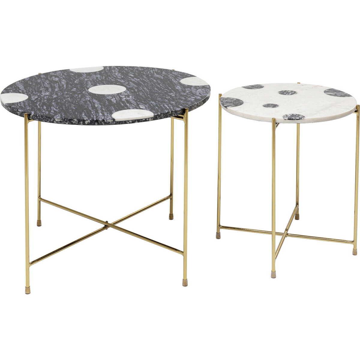 Handgearbeitete Polka Dots in Schwarz und Weiss auf runden Tischplatten in Marmor-Optik - Klingt viel versprechend, oder? Diese modernen Beistelltische bieten zwei Grössen: ein Tisch mit den Massen 50x50x50cm, der andere mit 40x40x45cm. Sie ergänzen sich als Doppelpack und treten genauso schön als Solisten auf. Meist sind es nämliche die kleinen Dinge, die ein Zuhause zu einem richtigen Zuhause machen. Beistelltische spielen dabei eine grosse Rolle, denn sie sind vielfältig einsetzbar, machen Ihre vier Wände gemütlicher und bieten Platz, um eine schöne Vase oder eine kreative Dekoration schön in Szene zu setzen. Zum Beispiel im Wohnzimmer neben dem Sessel, um beim Lesen immer alles griffbereit zu haben oder auch als Nachttisch für das Schlafzimmer eignet sich der Beistelltisch super.Runde Beistelltische im 2er Set mit Tischplatten aus Kunstharz und Gestellen in Gold Grafisch verspielter Look dank der Polka Dots in Grau und Weiss Abstellfläche und Deko-Bühne im Wohnzimmer, Flur und SchlafzimmerEchte Unikate, da die Tischplatten in Handarbeit gefertigt werden Hochwertiges Gestell aus Metall und mit Messing veredeltProduktinformation Gestell: Stahl messing beschichtet, Epoxidharz Tischplatte, 20 mm Plattenstärke, 10 kg max. Belastbarkeit, handgearbeitet (Tischplatte), zerlegt