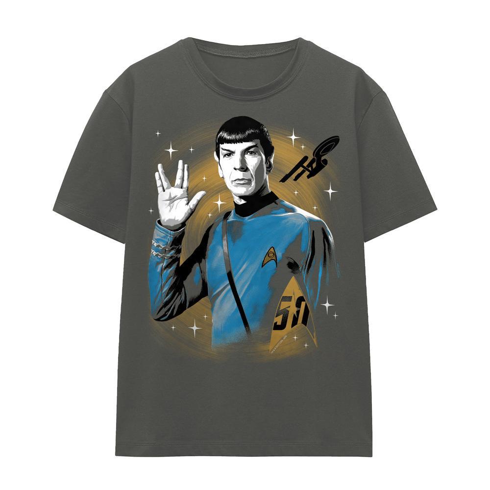 Dieses T-Shirt zeigt einen auffälligen Grafikdruck von Spock aus Star Trek und ist somit ein herausragendes Stück für Fans. Das Design zeigt Spock in seiner ikonischen blauen Uniform, wie er den vulkanischen Gruss ausführt, vor einem Hintergrund aus Sternen und der USS Enterprise. Ein '50'-Emblem ist ebenfalls sichtbar und feiert einen bedeutenden Meilenstein.