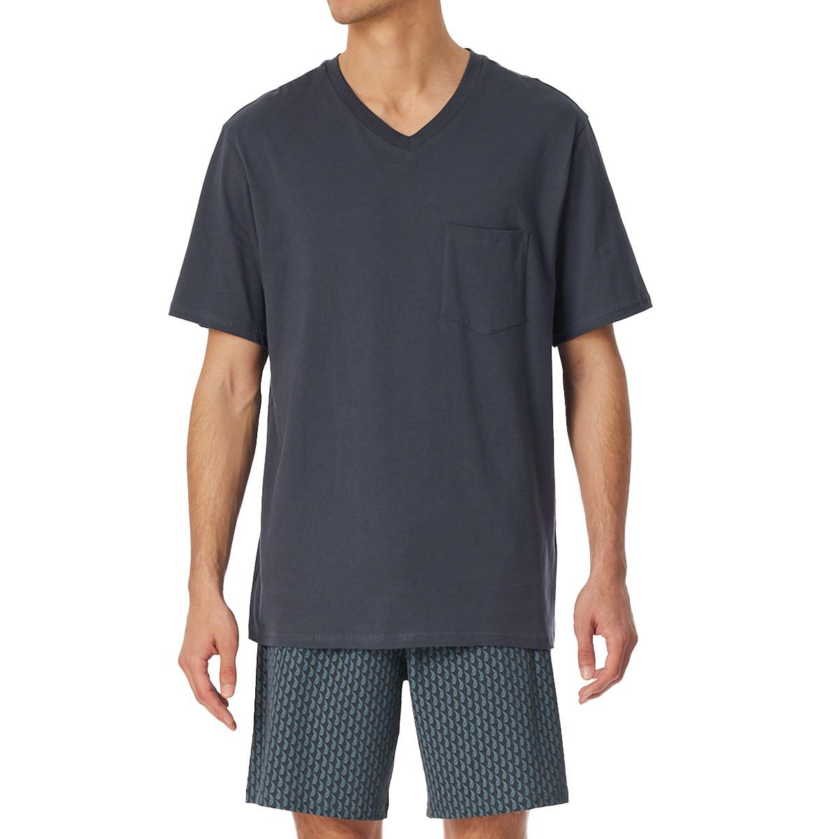 Kurzer Schlafanzug für Herren mit T-Shirt und Shorts aus der Serie Comfort Essentials. Das unifarbene T-Shirt mit V-Ausschnitt und aufgesetzter Brusttasche wird mit gemusterten Shorts mit elastischem Bund kombiniert. In angenehm weicher Single-Jersey-Qualität.