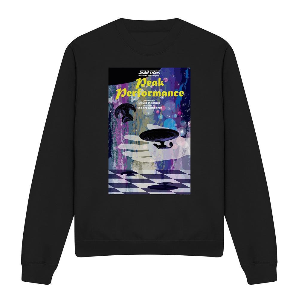 Dieses Sweatshirt zeigt einen Grafikdruck, der von Star Trek: The Next Generation Staffel 2 Episode 21 mit dem Titel „Peak Performance“ inspiriert ist. Das Design fängt die Essenz der Episode mit lebendigen Farben und ikonischen Bildern aus der Serie ein.
