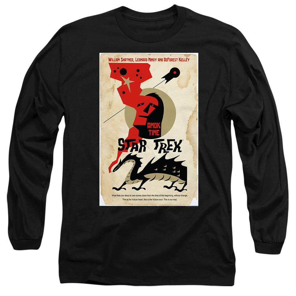 Dieses T-Shirt zeigt ein einzigartiges Grafikdesign, inspiriert von "Amok Time", Episode 30 von Star Trek: The Original Series. Das Design fängt die Essenz der klassischen Science-Fiction-Show mit einer stilisierten Darstellung von Charakteren und thematischen Elementen ein.
